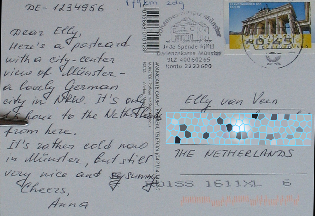 Dear Elly, Here’s a potcard with a city-center view of Münster, a lovely German city in NRW. It’s only 1.5 hour to the Netherlands from here. It’s rather cold now in Münster, but still very nice and sunny. Cheers, Anna.