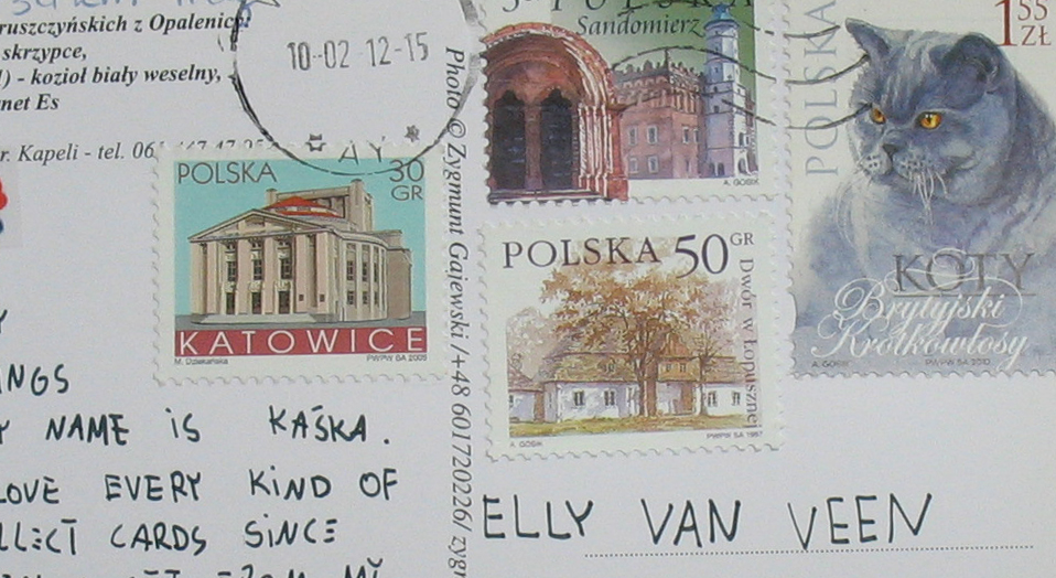 Uit Polen komt een geweldige kaart, van dit soort plaatjes hou ik, en aan de postzegels is ook zorg besteed. Kaska heeft in mijn profiel gezien dat ik Brits Korthaar katten heb, en ik kreeg daar een prachtige postzegel van. Dit vind ik superlief. Kaska schrijft: Hello Elly. sending you my warmest greatings from Poland. My name is Kaska. I’m 30 Y.O. I love every kind of postcards. I collect cards since I was kid, when I get from my friend card ( made in Czech) at christmas. It was chockolate horses on turqose back ground. De kaart heeft de 834 km in 11 dagen afgelegd.