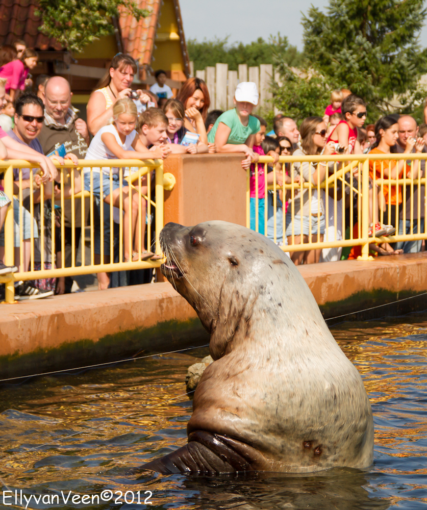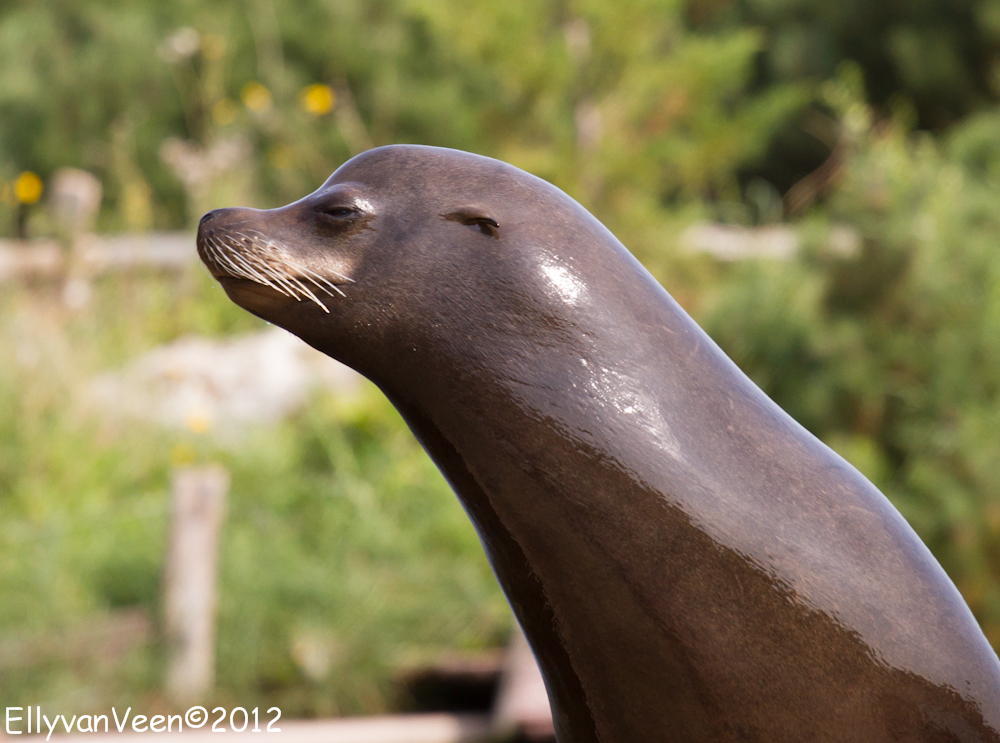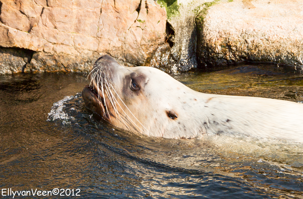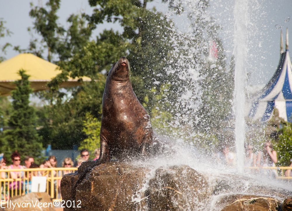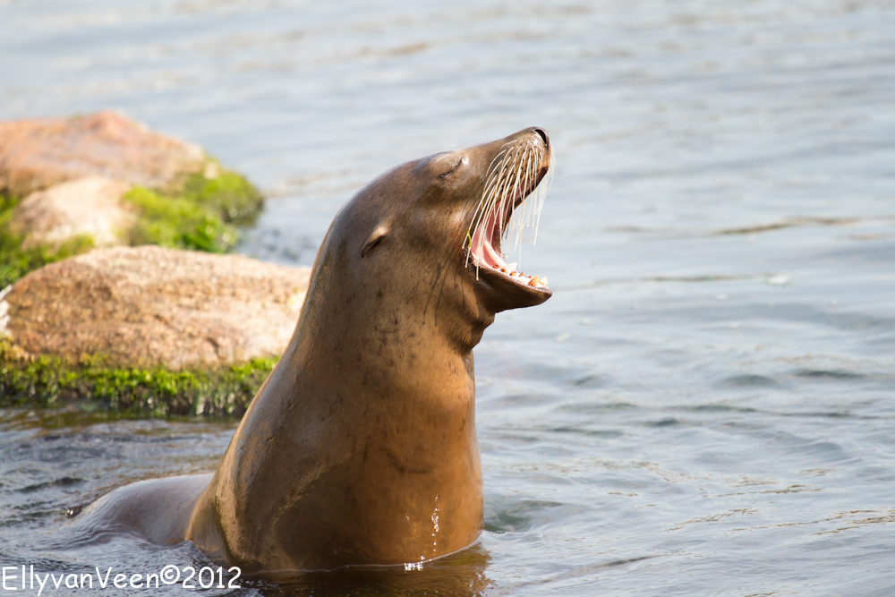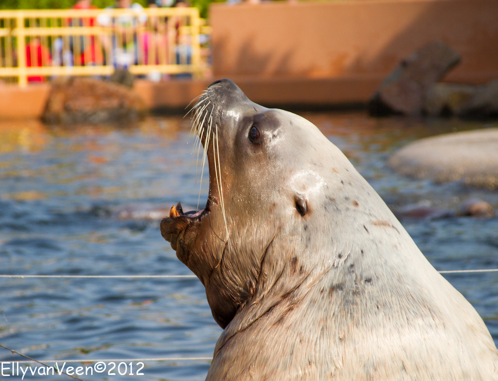 Ik heb wat rondgewandeld en foto’s gemaakt. Bij de dolfijnen was de lagune afgesloten: het was speciaal zwemmen met een groep kinderen. Helaas dus geen Flipper voor mij…nou ja, ééntje dan. Ik vind het opmerkelijk en niet echt klantvriendelijk: zoveel geld betalen, dan niet overal mogen komen en dat midden in het hoogseizoen. Gelukkig kon ik wat leuke plaatjes schieten van de Steller Zeeleeuwen, Walrussen, zeehonden en gewone zeeleeuwen.