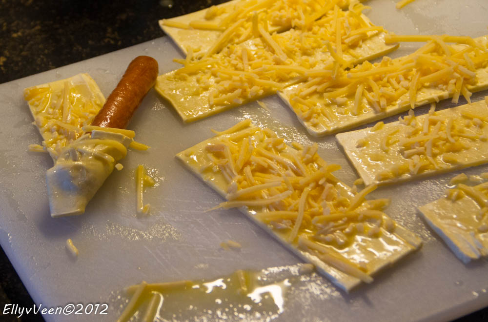 Je rolt het worstje in het bladerdeeg en aan de buitenkant smeer je nog wat geklutst ei. Dan gaan de worstjes voor 20 minuten de oven in op 200 graden