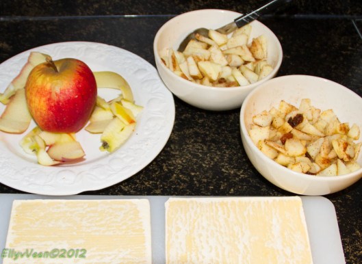 De plakje bladerdeeg vul ik met het appelmengsel en ik vouw er driehoekjes van. Nog even insmeren met ei en dan kan het de oven in. Natuurlijk heb ik teveel appel, dus dat gaat lekker in de yoghurt: toetje voor vanavond is dus ook al geregeld