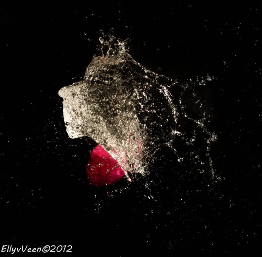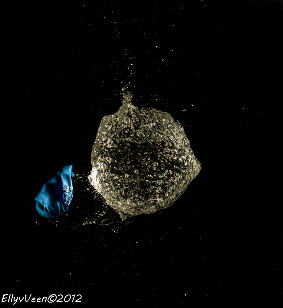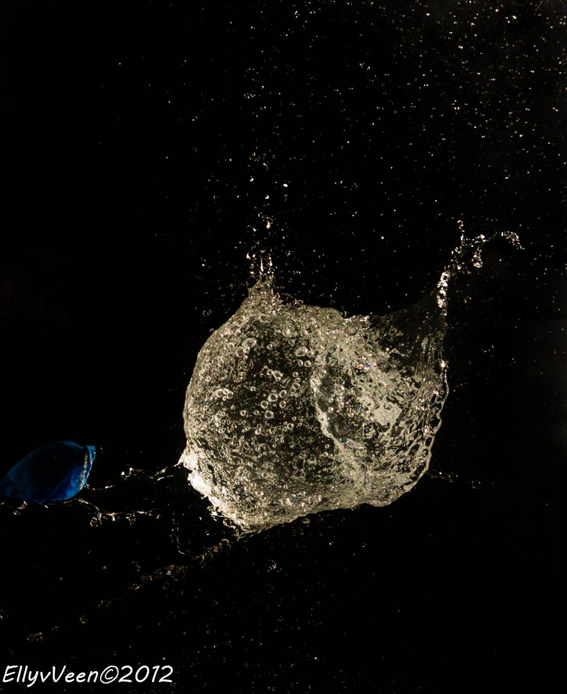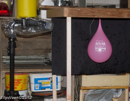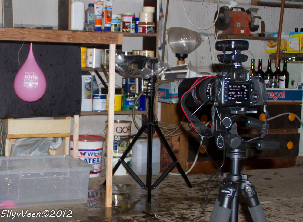 Het fotograferen van ballonnen -gevuld met water- welke worden lek geprikt is een leuk en nat tijdverdrijf. H. had een stellage getimmerd zodat Joke en ik ons konden uitleven. En dat hebben we gedaan! Gelukkig had Joke de flitsers met plastic beschermd, want het water spatte verder als we dachten…