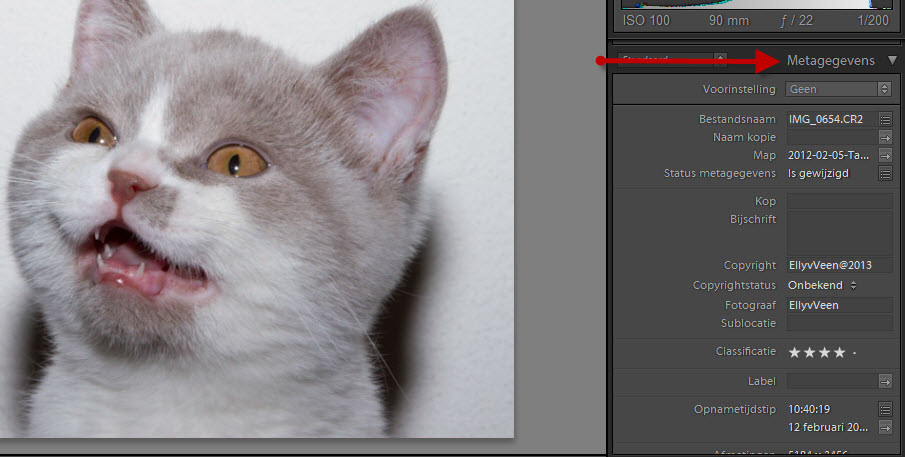 Exif-gegevens zie je niet direct, maar het is niet al te moeilijk om deze te bekijken. Je kunt de Exif bekijken in een foto-bewerkingsprogramma, maar het kan ook met Windows Verkenner en bv Lightroom ( zie onderstaande afbeelding)