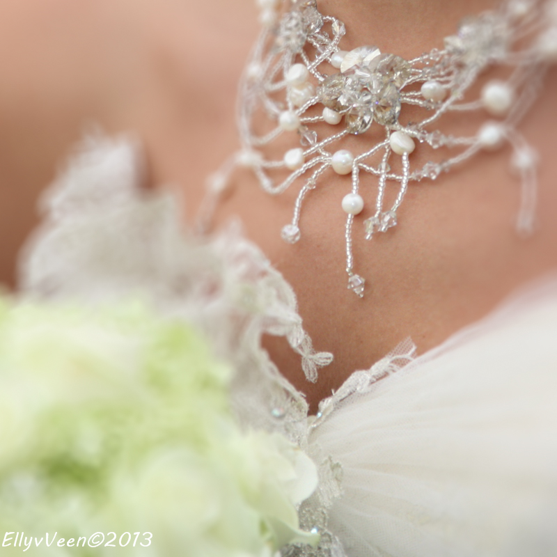 De prachtige halsketting is door de bruid zelf gemaakt. Voor bijzondere sieraden: Brandless Jewels