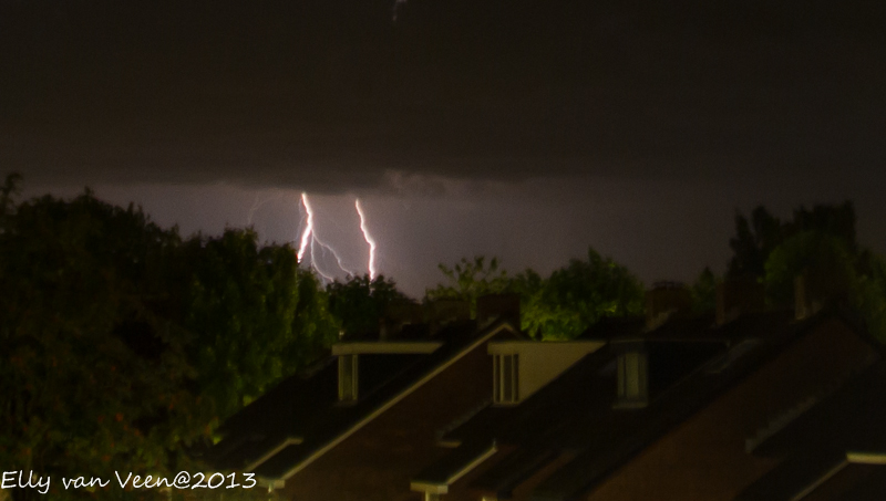 Toen het ook nog begon te stortregenen ben ik maar snel naar huis gegaan. Uit het zolderraam heb ik mijn eerste bliksemfoto gemaakt…..en ik ben bang dat het ook mijn laatste is…het stormchasen laat ik maar aan anderen over..