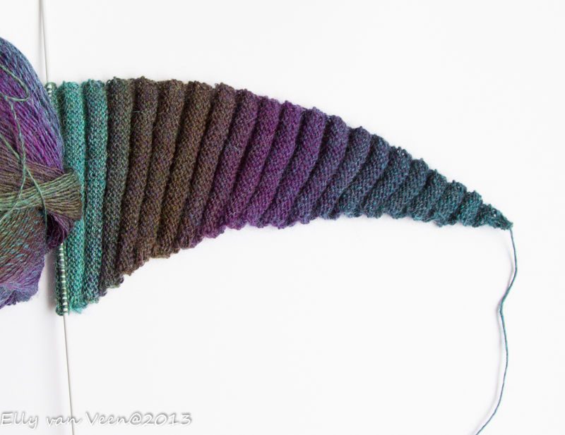 Halverwege de eerste frangiflutti heb ik alles weer uitgehaald, ik vond de sjaal te “stijf” worden. Met dikkere naalden ben ik overnieuw begonnen. Maar ik ben nog niet echt tevreden, ik ga de volgende sjaal op veel dikkere naalden breien om een mooi los effect te krijgen. ( En dan denk ik aan wol voor nld 3 op nld nr 5 of zo)