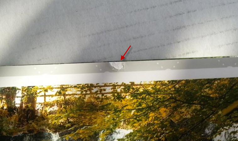 Helaas zat er op 1 blz een kleine beschadiging. Ik heb er een fotootje van gemaakt en gemaild naar de klantenservice. Ik had al snel antwoord: Ze vinden de beschadiging niet acceptabel en er wordt -kosteloos- een nieuw album gedrukt en verstuurd.