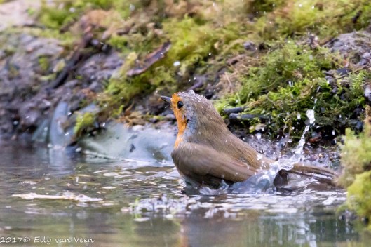 Het roodborstje (Erithacus rubecula) ging ondertussen aan de overkant in bad. Wat zijn ze toch schattig en leuk. Het is echt leuk om ze vanuit een vogelhut zo te kunnen bekijken. Alle vogels vind je op Flickr