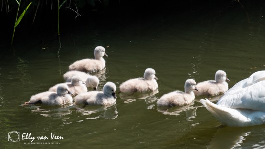 Niets is zo vertederend als pluizige pulletjes. Deze moeder met 8 ukkies zwemt trots rond. De kleintjes zijn pas 2 dagen uit en volgen moeder dapper.