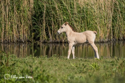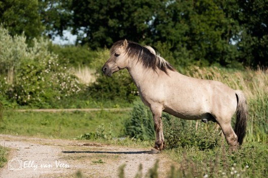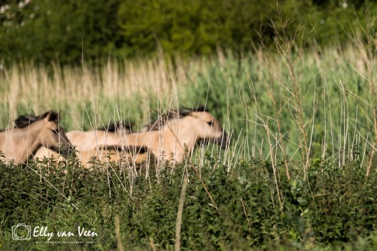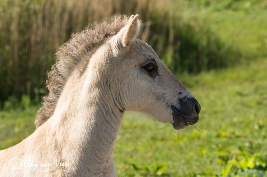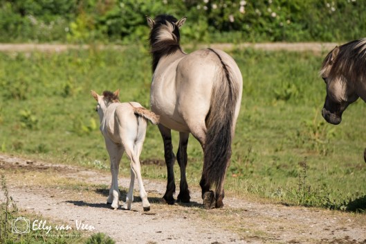Ik had er al een flinke wandeling opzitten in de Oostvaardersplassen en was bijna bij de auto toen deze Konik op de weg voor mij ging staan met de boodschap: tot hier en niet verder. Ik zag niets om me heen dus ben op een picknicktafel gaan staan en toen zag ik moeder met jong in het hoge gras lopen.