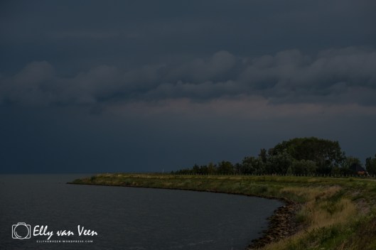 Na de hittegolf van afgelopen week sloeg het weer om. Als je vlak bij het Markermeer woont, loont het de moeite om te gaan kijken. Opeens werd het gisteravond zwart en kwam er een enorme bui over het water onze kant op.