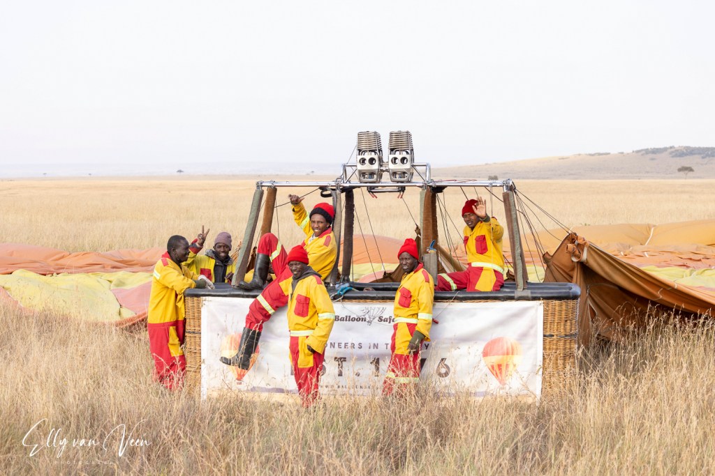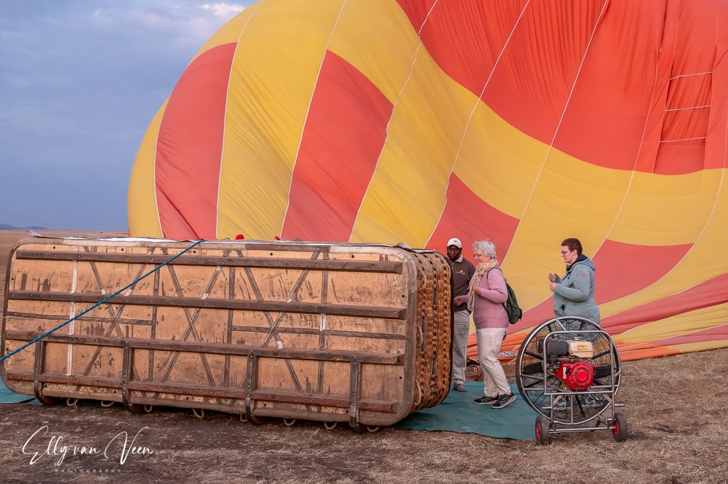 Het vroege opstaan begint al gewoonte te worden. 04.00 wordt heel gewoon…maar we gaan dan ook een ballonvaart maken bij zonsopgang over de Masai Mara. Als we aankomen wordt er al druk gewerkt aan de ballons.