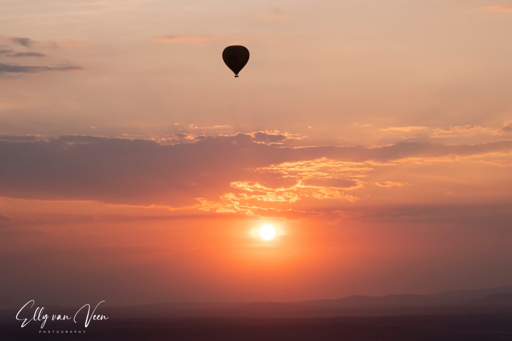 En dan gaan we….langzaam vliegen we en gaan hoger en hoger. De zon komt prachtig op en we vliegen door een pastelkleurig landschap. Onder ons lopen dieren die alweer onderweg zijn. Ze trekken zich weinig aan van ons. Ze zullen het gewend zijn.