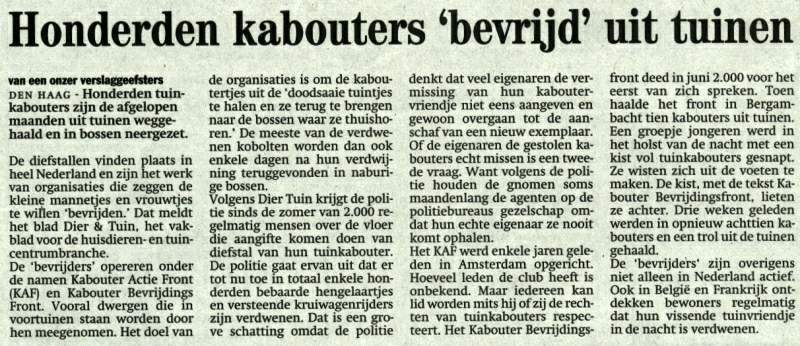 Een aantal jaren terug heb ik altijd moeten gniffelen als er weer een bericht in de krant kwam over het Tuinkabouterbevrijdingsfront
