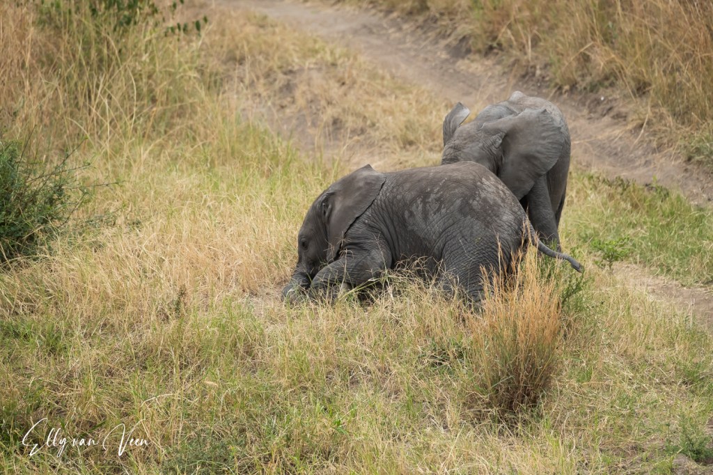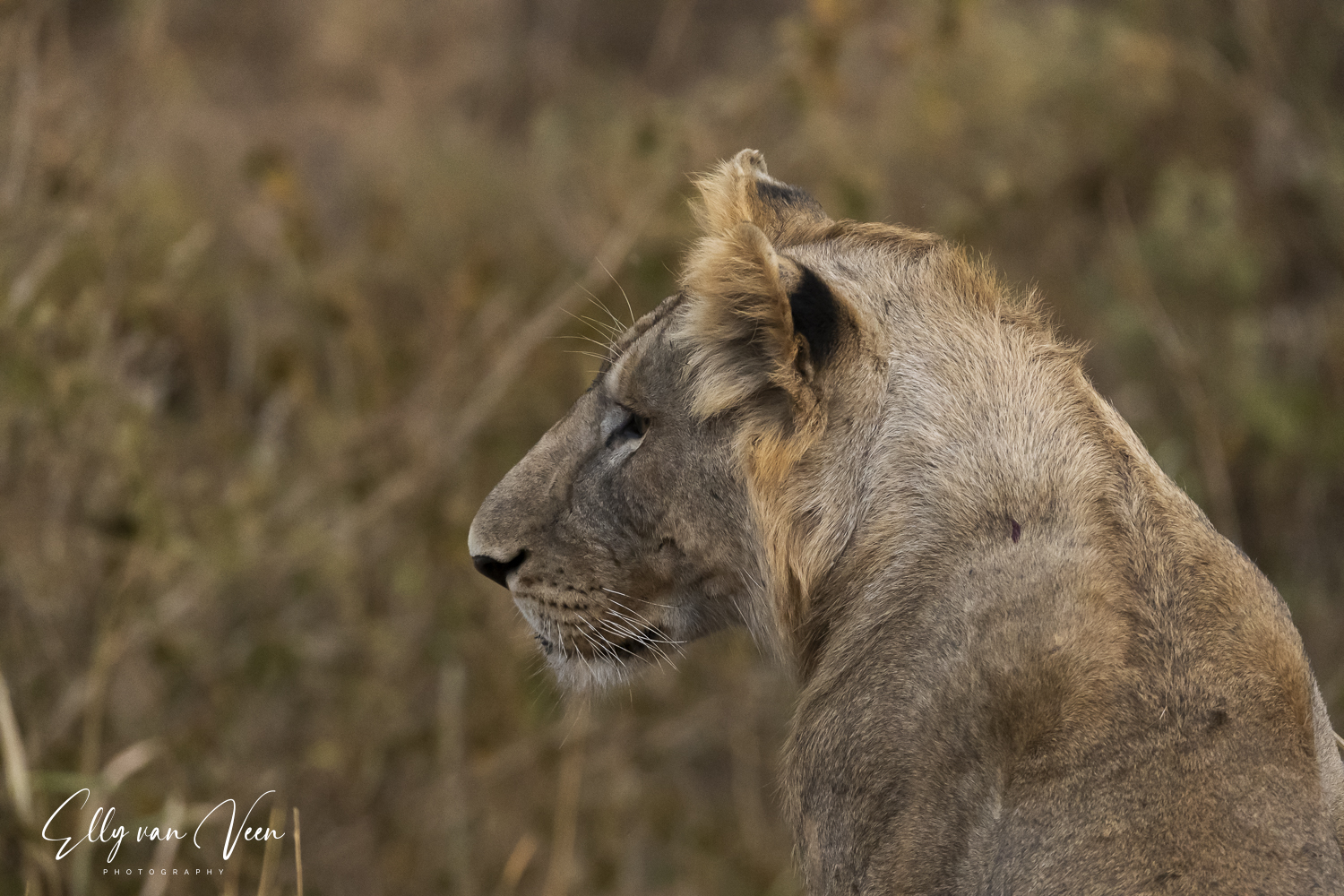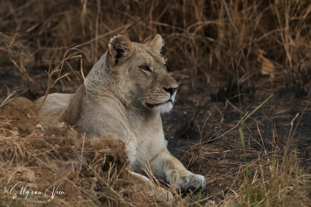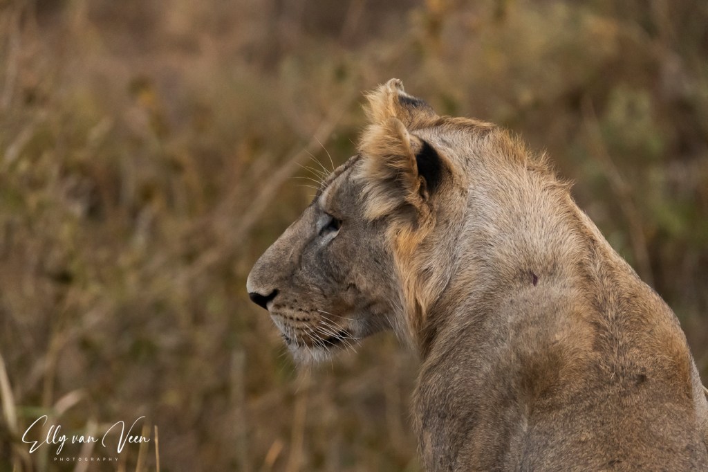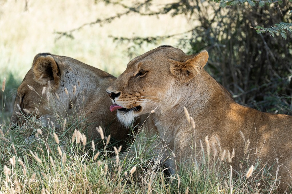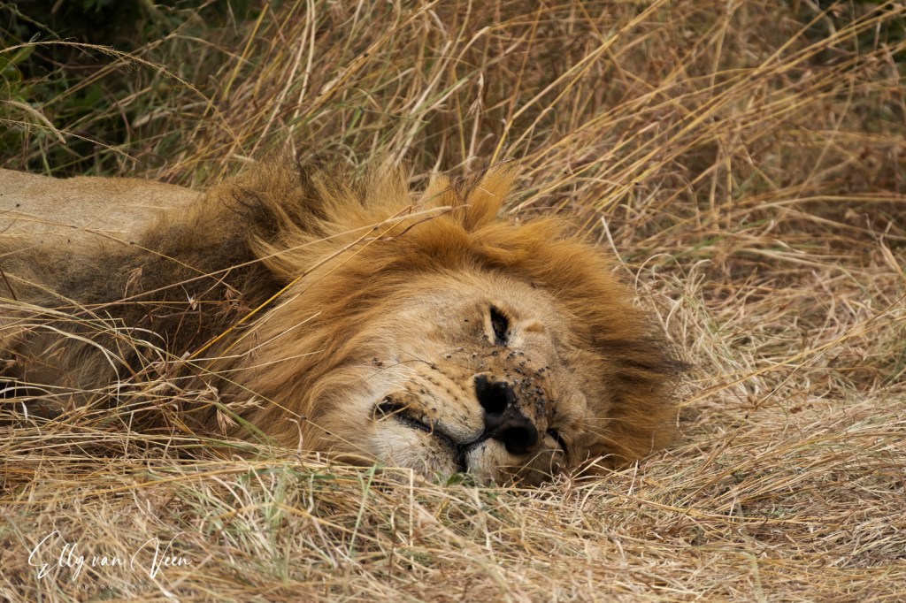 Even later liggen er 2 leeuwen langs de weg te hijgen in de schaduw. Na het maken van de foto’s wil onze auto niet meer starten. De chauffeur wordt door andere auto’s geblokt uit zicht van de leeuwen. Maar de leeuwen hebben door dat hier misschien iets te halen valt.. maar gelukkig is het snel gerepareerd en kunnen we verder.