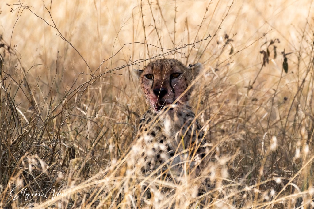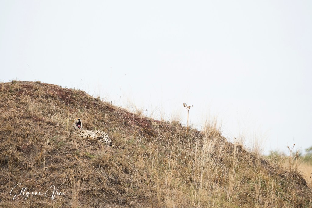 Er zijn cheeta’s gezien. We moeten goed kijken, want ook deze dieren gaan op in het landschap. Fantastische dieren om te zien en wat zijn ze snel. Ze liggen in het hoge gras en komen af en toe omhoog om te kijken. Daarna zijn ze weer onzichtbaar.