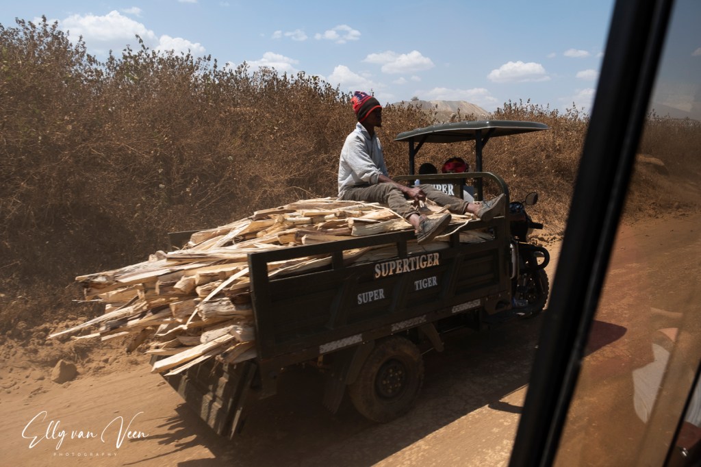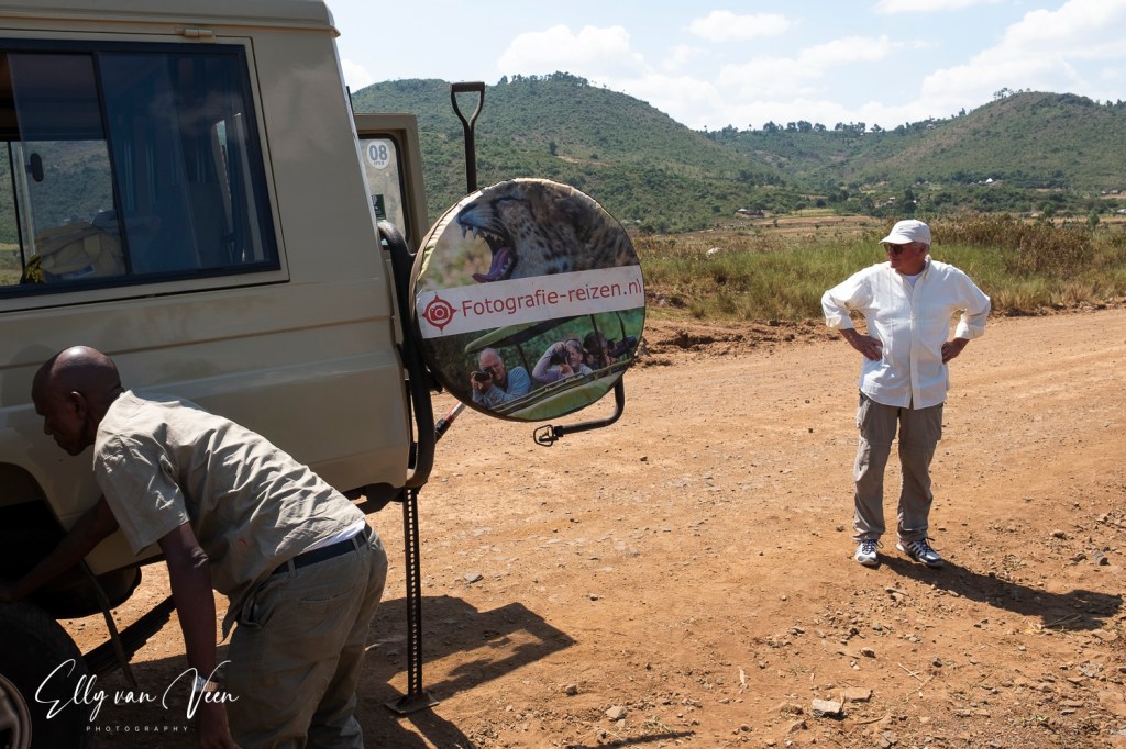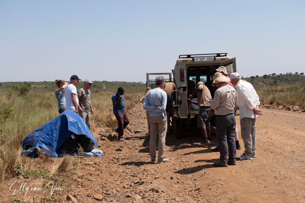 Het gaat gesmeerd, te gesmeerd want onderweg krijgt de auto achter ons panne. Alle bagage wordt overladen en we schuiven in zodat we nu in 2 busjes passen. Er is een as afgebroken dus voor deze auto is het einde oefening. Eigenlijk kunnen onze gidsen/chauffeurs heel veel zelf repareren, maar dit is té. Al snel wordt er vervangend vervoer geregeld en na een uurtje gezellig dicht op elkaar krijgen we weer ruimte