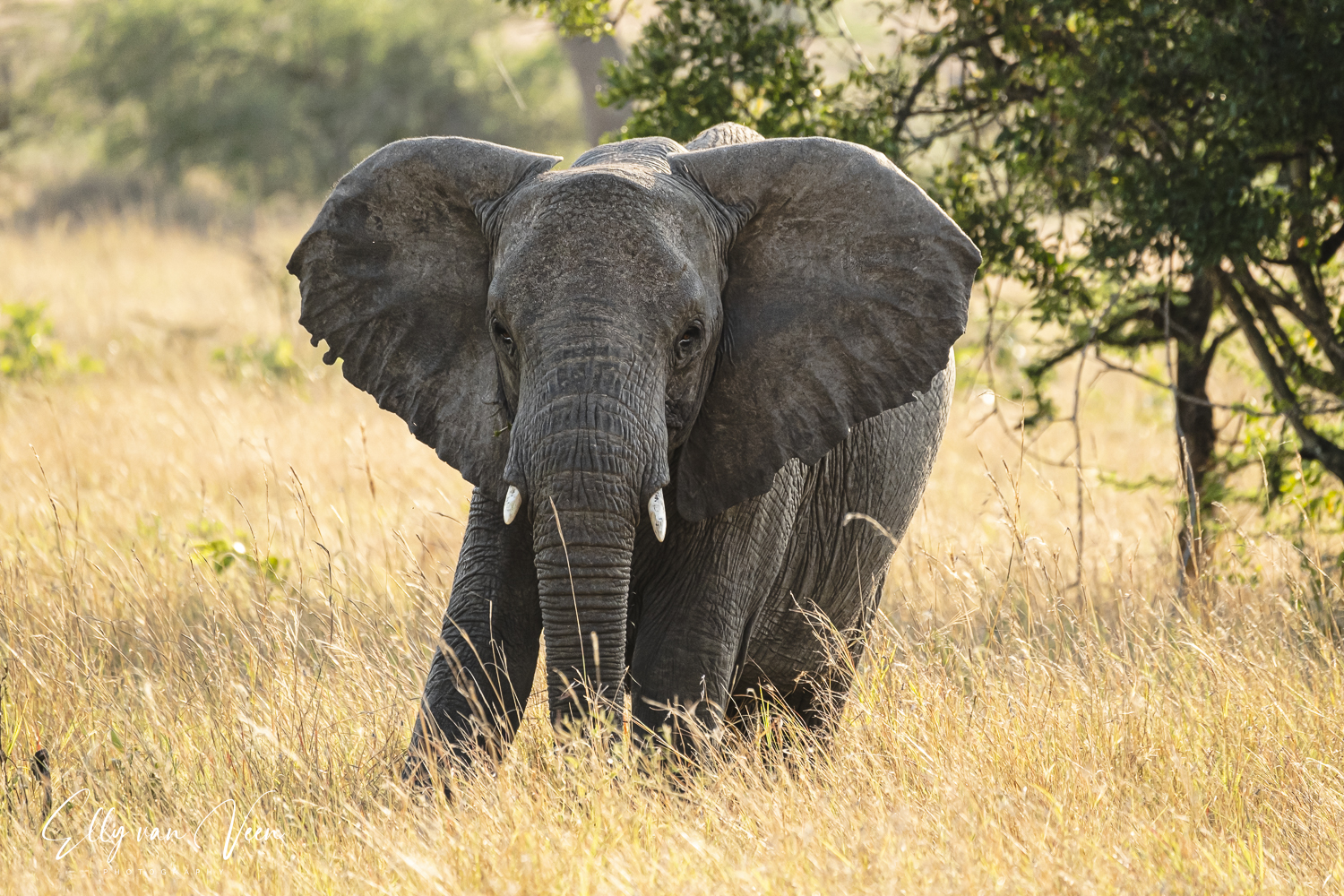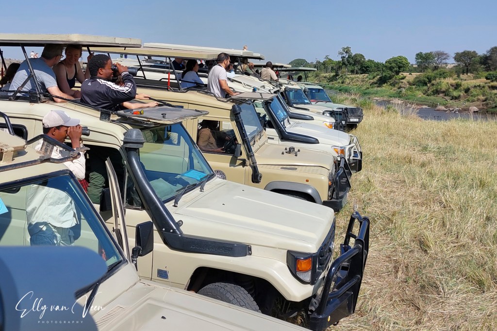 In de Serengeti is het spotten van wild moeilijker maar een olifant zie je toch snel. We gaan in de line-up staan voor de rivercrossing. Je moet afstand houden van zo’n 100 meter tot de oever en als het sein er is, hebben we een F1-start voor het beste plekje.