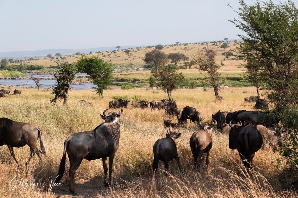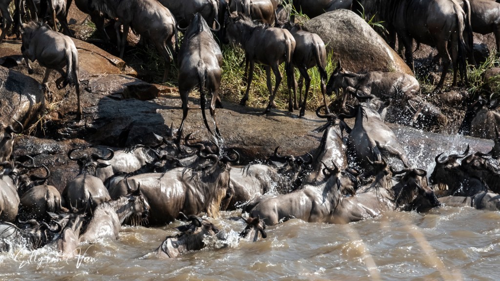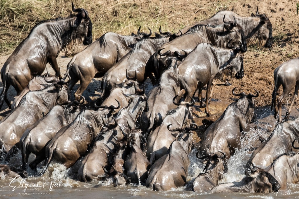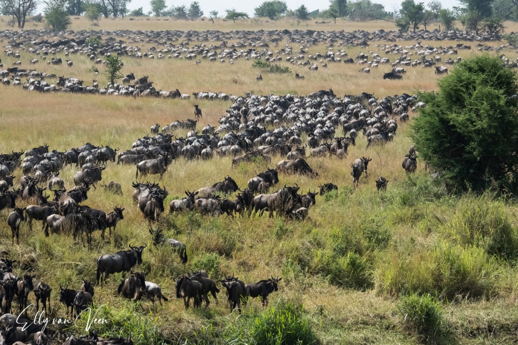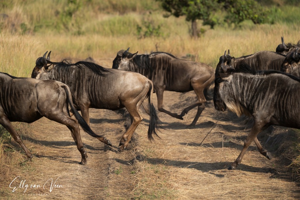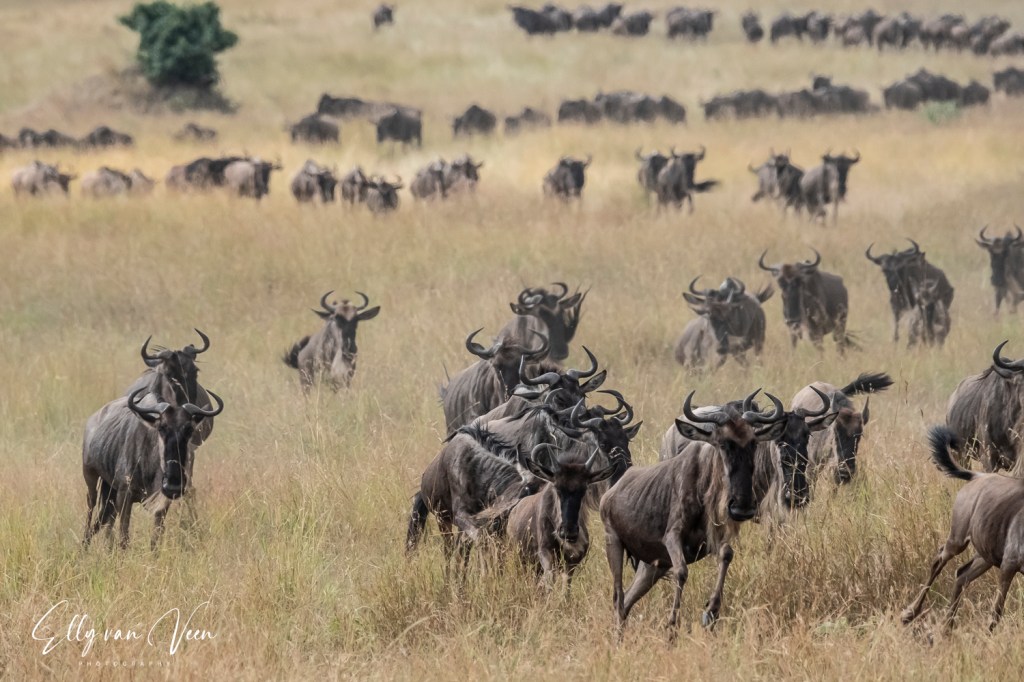Het is bizar om te zien hoeveel Gnoes zich verzamelen, ze komen van alle kanten aangelopen. Ze grazen, luieren en kijken gewoon wat rond. En opeens is daar het sein dat ze gaan, wie zet dit in beweging?? het is mij onduidelijk maar de hele kudde gaat bewegen en in de verte zie je de gnoes aan komen rennen. Alsof ze allemaal een WhatsAppje hebben gehad voor een Project X bij de rivier Mara