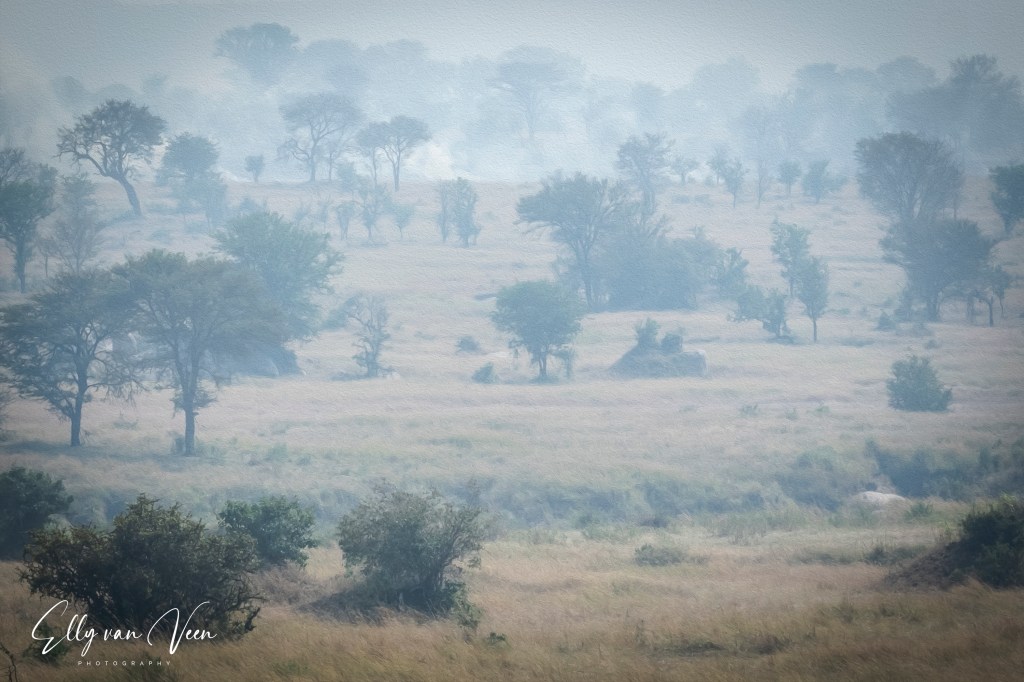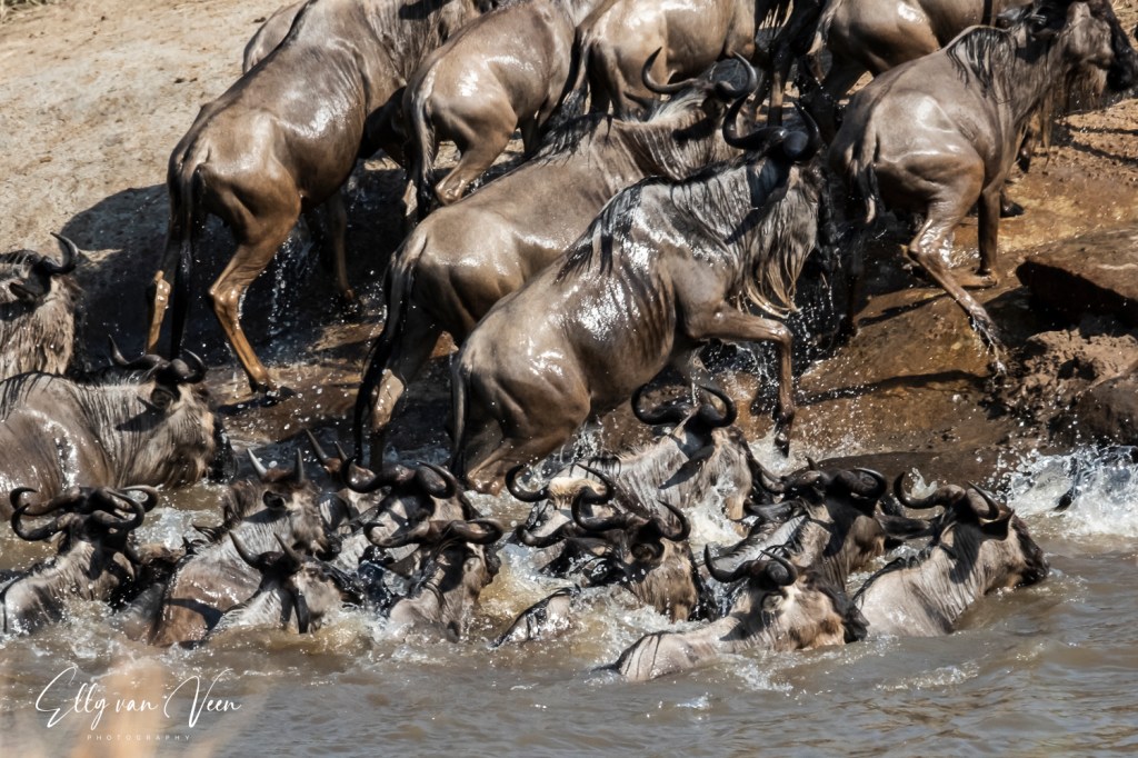 Over de Serengeti hangt een rooksluier. Er zijn aan de horizon branden te zien. Het oude gras wordt gecontroleerd afgebrand. Na een regenbui komt het groene gras tevoorschijn, het verse gras wat de gnoes en zebra’s willen eten. Ik kan me voorstellen als gnoe dat je niet staat te popelen om richting brand te gaan. Maar het instinkt is te sterk. Met 1000den storten ze zich in de rivier. Fascinerend..wat geweldig. Ademloos kijken we toe.