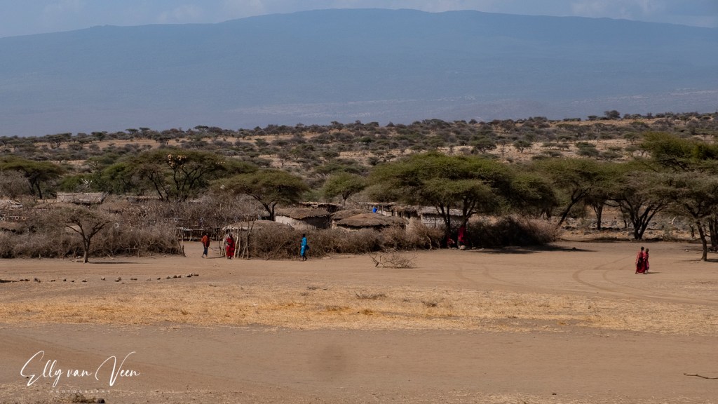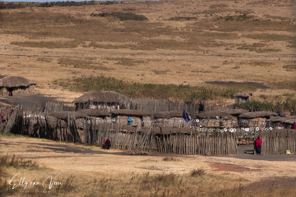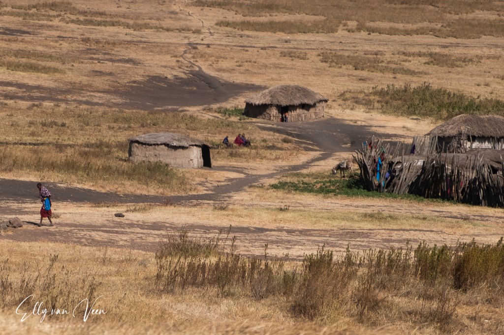 We zien Masaidorpen langs de weg en we stoppen bij een uitzichtpunt over de krater.