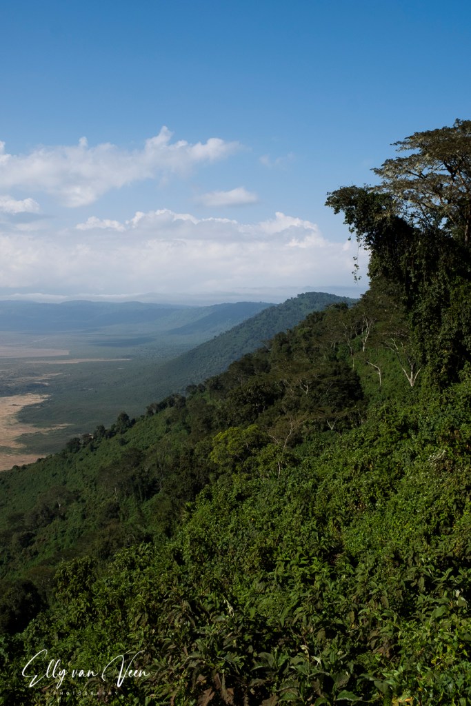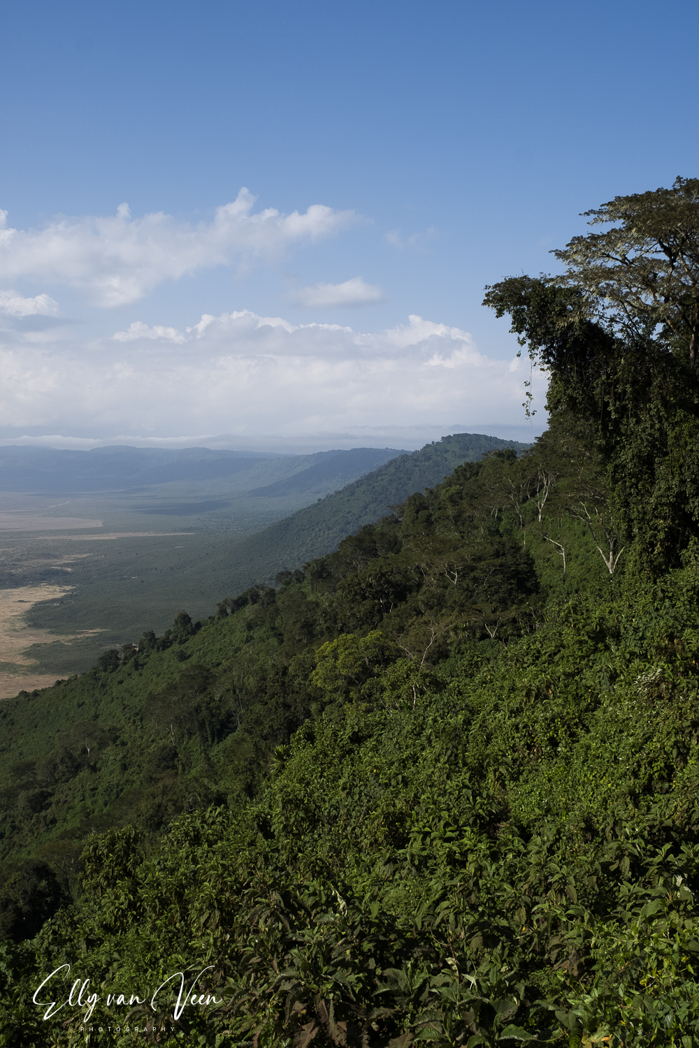 We nemen afscheid van de zinderend hete Serengeti en rijden langs de kraterrand van de Ngorongoro. Opeens lijkt het of we in de tropen zitten.