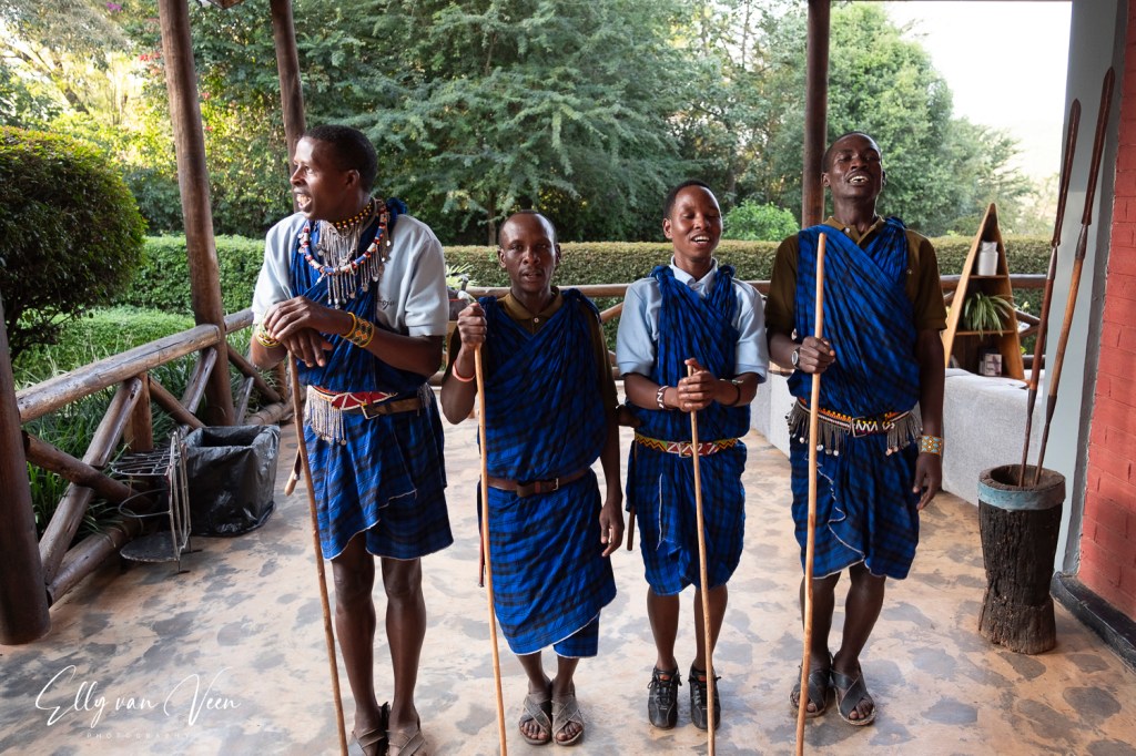 Daarna ontmoeten we de Tanzaniaanse gidsen. We krijgen een prachtig Masaikleed kado. Hier gaan we nog veel plezier van beleven, het is een heerlijke doek om om te slaan, maar ook om de apparatuur tegen stof te beschermen.