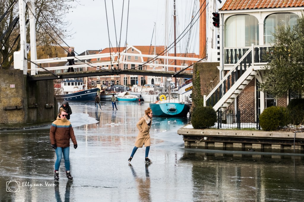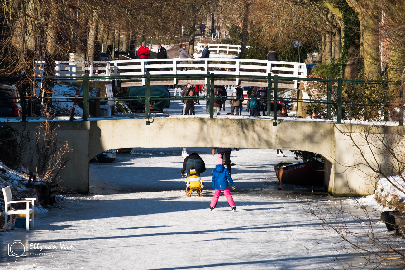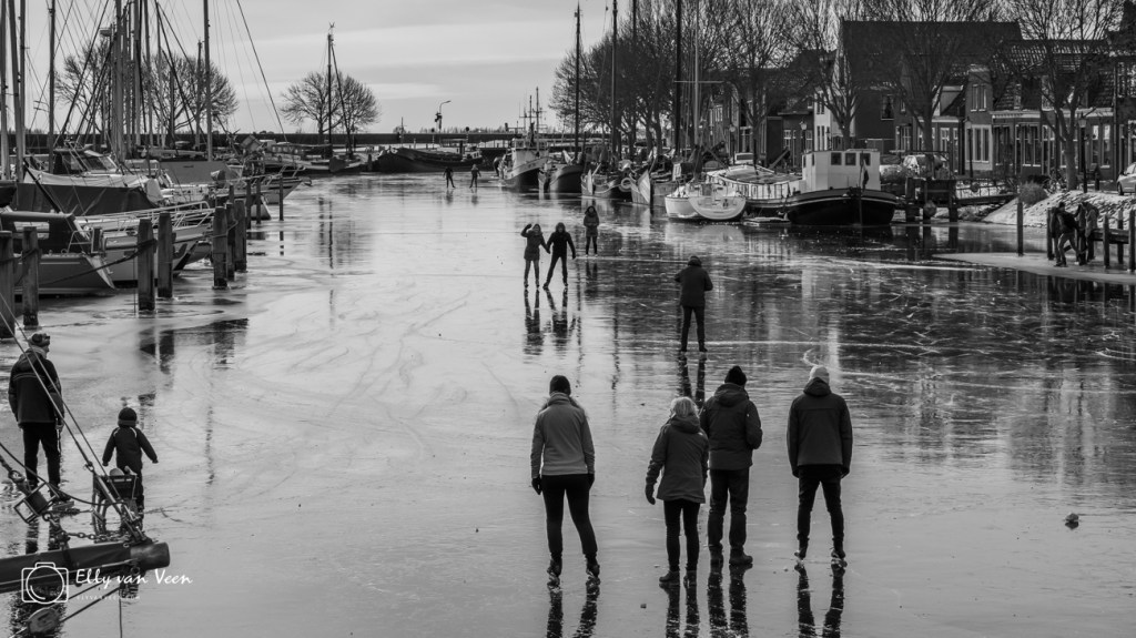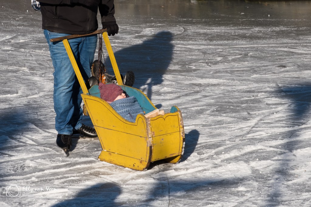 Jong, Oud, met of zonder stoel, sleetje, klunen, vallen, opstaan, kleurige mutsen, koude neuzen, warme chocomel…..overal waar je keek zag je vrolijkheid en stralende gezichten. Durf-allen gingen buiten de grachten en kozen het ruime sop. Het ijs kraakte, boog, zuchtte , maar bleef heel.
