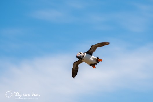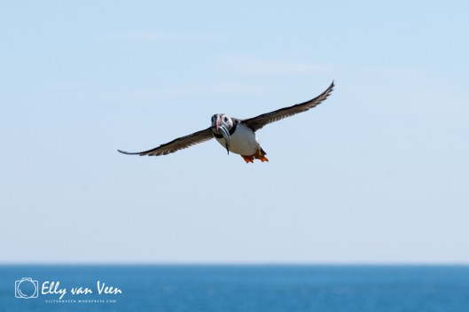 Natuurlijk was de “droomfoto” een puffin in volle vlucht met een bek vol zandspiering en dat is gelukt! Het was lastig door de volle zon en het felle licht, maar ik kreeg het wel voor elkaar.