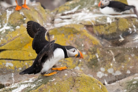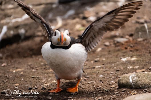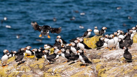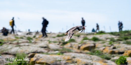 Overal zie je papegaaiduikers lopen en vliegen, de bekken vol met zandspiering, die ze met weerhaakjes vasthouden in de bek. Ze zijn razendsnel dus het was wel even een uitdaging om te kijken hoe ik ze het beste kon fotograferen, want het zijn turbo-raketjes die langs je scheren. Maar na een tijdje ontdekte ik een patroon waardoor ik beter kon focussen.