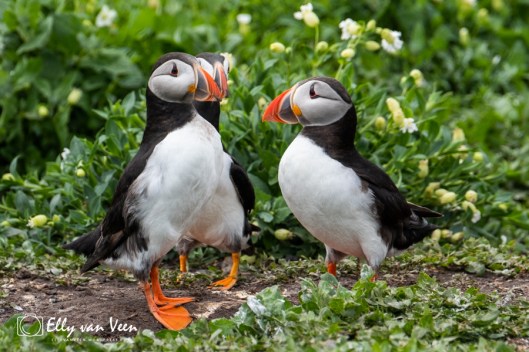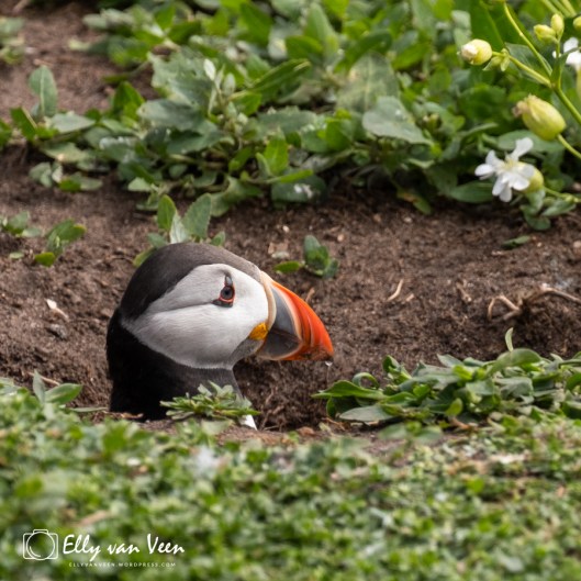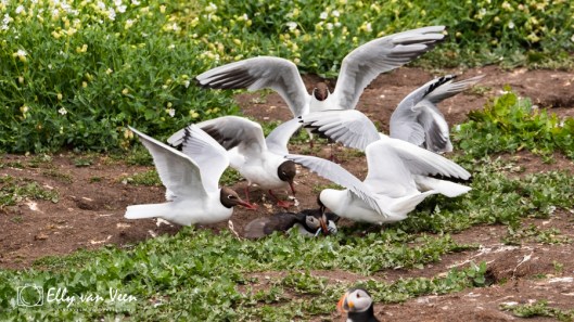 Het is voor de papegaaiduikers een hele klus om de vis bij de pulletjes te krijgen. Het nest is ondergronds en ze worden opgewacht door hongerige kokmeeuwen die voor het gemakkelijke maaltje gaan. Het was gewoon sneu om te zien hoeveel moeite de papegaaiduikers moesten doen om veilig bij het nest te komen. Eerst de boel verkennen, is de kust wel veilig, dan razendsnel zien te landen en je holletje induiken. En dat ging niet altijd goed..