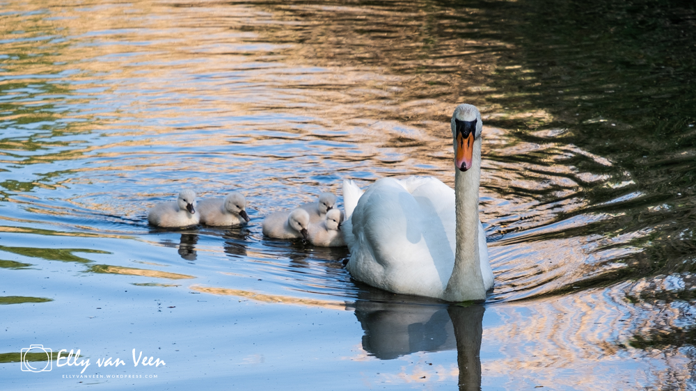 Niets is zo vertederend als pluizige pulletjes. Deze moeder met 8 ukkies zwemt trots rond. De kleintjes zijn pas 2 dagen uit en volgen moeder dapper.