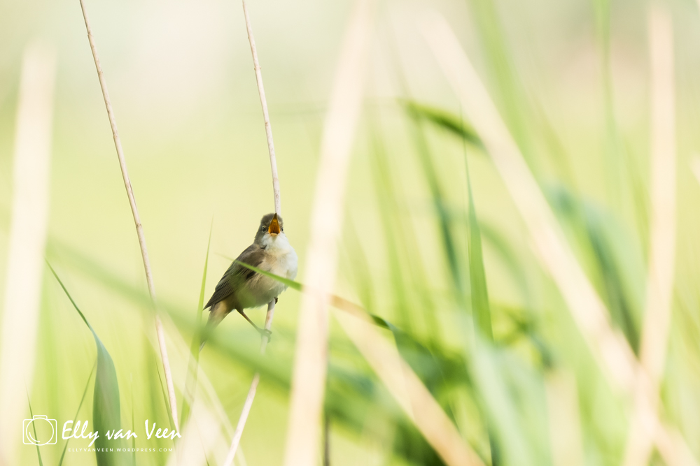Opeens verrastte dit ukkie me met een concert. Omdat ik het leuk vind om er een naam bij te hebben, had ik de foto op een forum gezet. En dan komen de vakmensen om de hoek kijken… De één zegt rietzanger ( uittleg: het zit in het riet en het zingt…) de volgende : kleine karekiet en daarna is het een bosrietzanger. (uitleg: Zie een vrij koudbruine vogel, lange handpenprojectie, duidelijke lichte toppen erop, maakt het voor mij een Bosrietzanger)