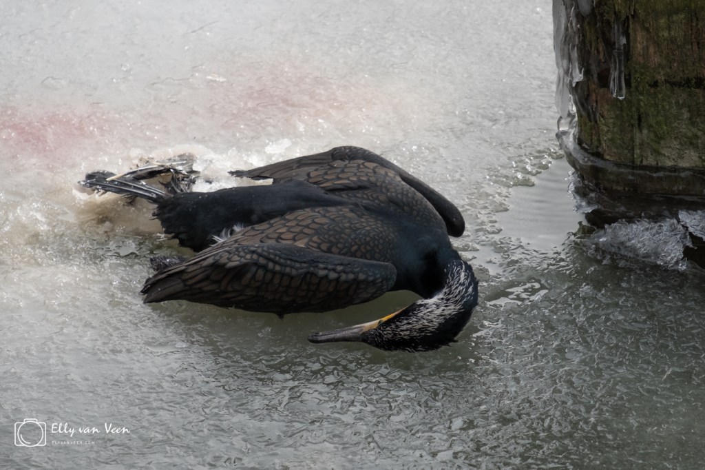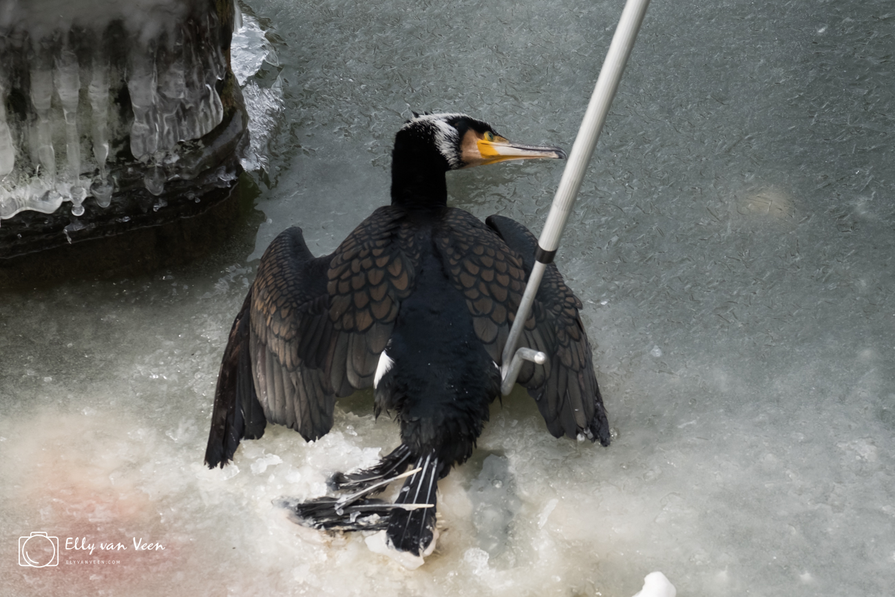 Veel vogels overleven de kou niet, ik heb veel dode vogels zien liggen, boven en onder het ijs. Deze aalscholver heeft het niet gered, hij ging dood terwijl we keken, ondanks de pogingen van de dierenambulance. Deze aalscholver had het bruidskleed al aan, om de dames te imponeren, de kop en staart krijgen dan witte veren
