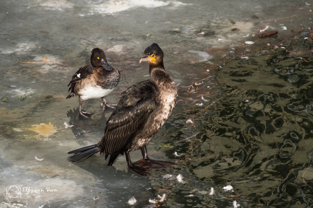 In de haven stond de aalscholver op het ijs. Het kuifeend achter hem is een stuk kleiner, maar niet minder mooi..