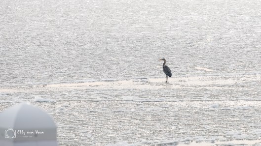 De reiger stond op het IJsselmeer te kleumen. Een bijzonder beeld vond ik het.
