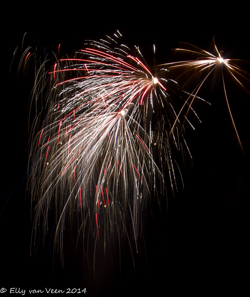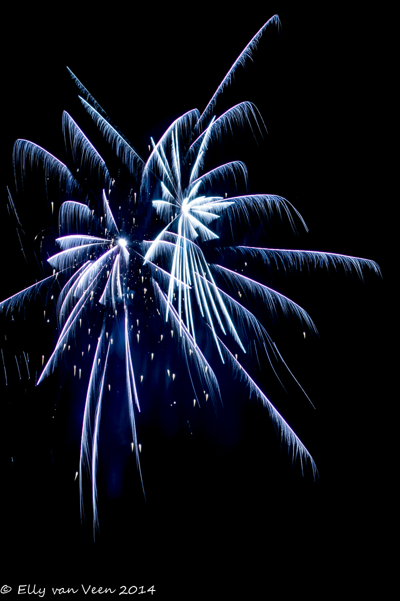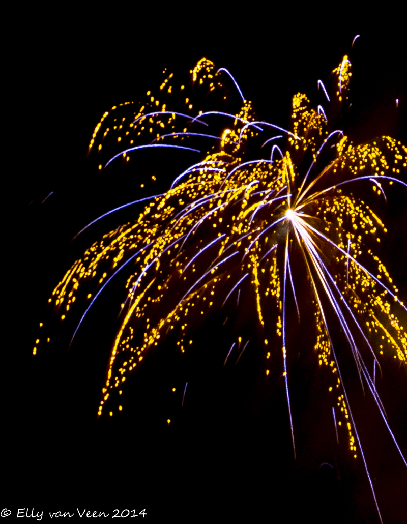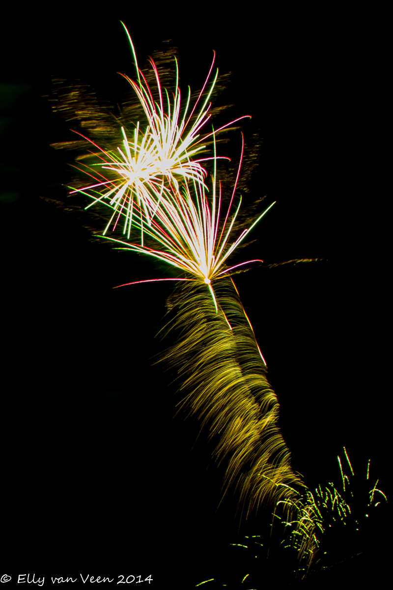 Ik had 187 foto’s gemaakt en de eerste shift ging snel, 140 konden er zo de prullebak in ( hoe deden ze dat toch in het Analoge tijdperk??) Na een tweede kritische blik hield ik onderstaande foto’s over. En al zijn het niet de allerbeste foto’s die ik ooit heb gemaakt, met trots kan ik zeggen: ik heb vuurwerk gefotografeerd…maar jeetje wat is dat moeilijk zeg…………..