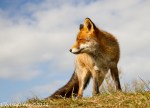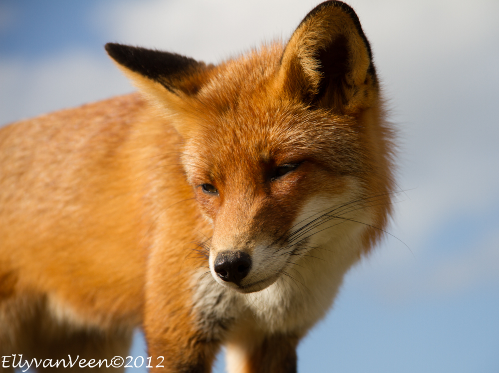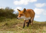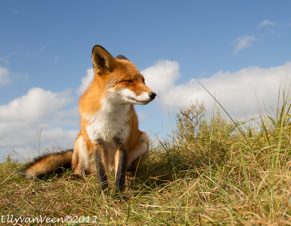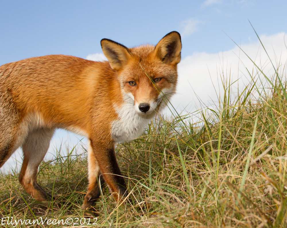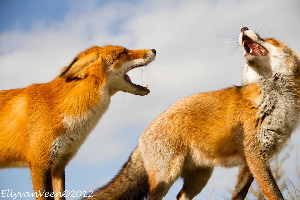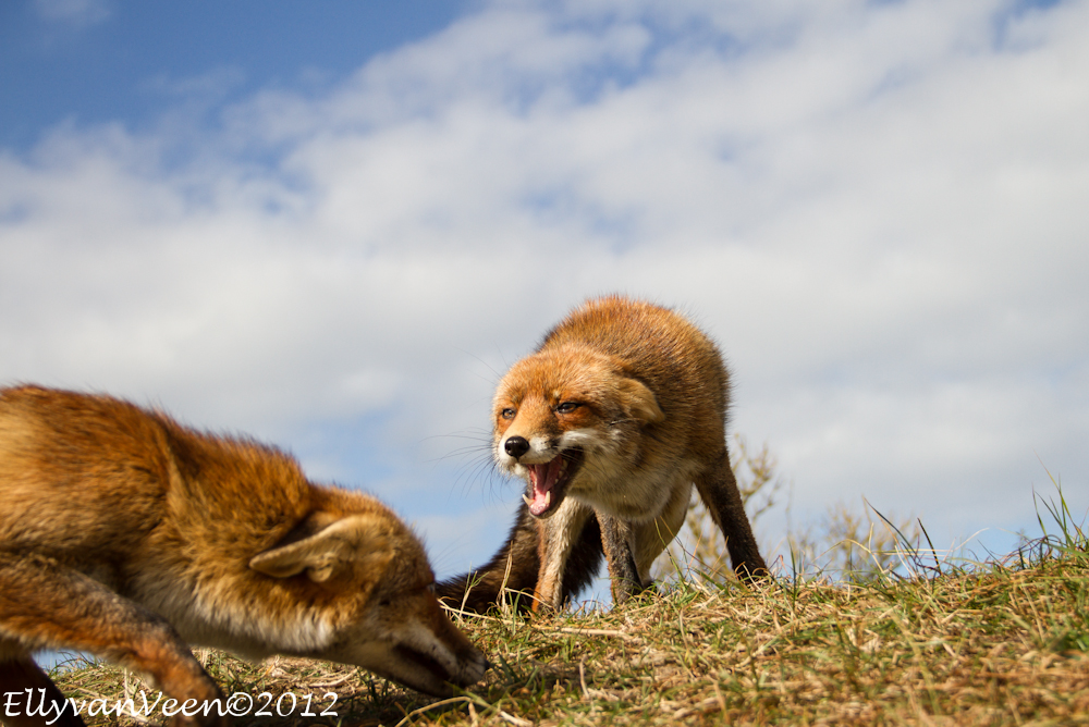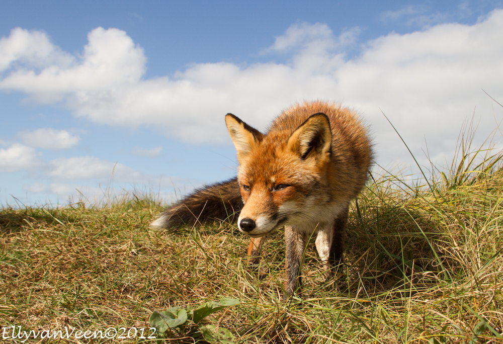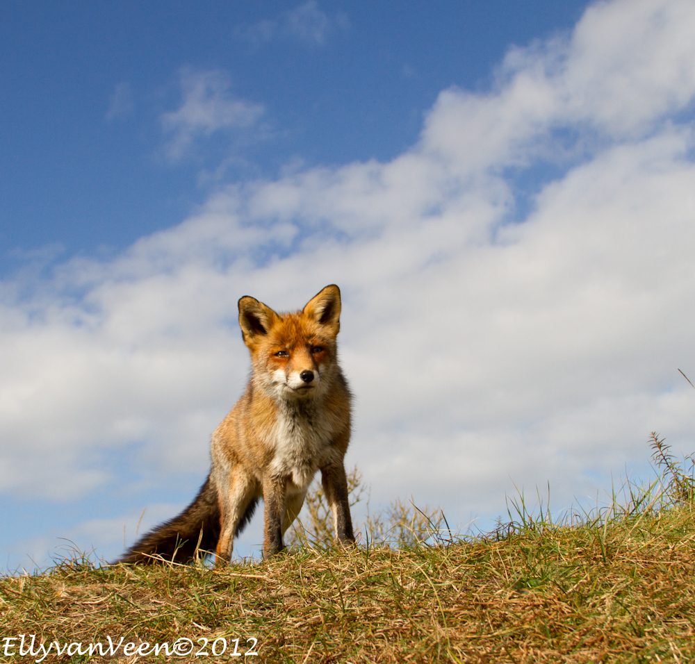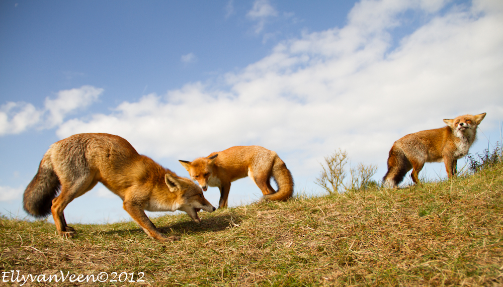 Gisteren heb ik met 2 foto-maatjes een flinke wandeling ( zo’n 10 km )  door de AWD gemaakt. Een uitgestrekt natuurgebied waar je ogen én oren te kort komt. We wilden proberen een vos, -de Vulpes vulpes- te fotograferen, maar dat we zó verwend zouden worden, hadden we niet gedacht. Terwijl we in een duinpan heerlijk zaten te genieten van het zonnetje, kwam daar al snel 1 vos, welke al rap werd gevolgd door nog 2 soortgenoten. Omdat we lager als de vossen zaten, konden we prachtige foto’s maken, met een stralend blauwe lucht als achtergrond. En wat werden we verwend, er werd gedreigd, geloerd en gegromd naar elkaar. We waren er diep van onder de indruk, wat is de natuur toch fantastisch en wat bijzonder dat we dit van dichtbij mochten meemaken.