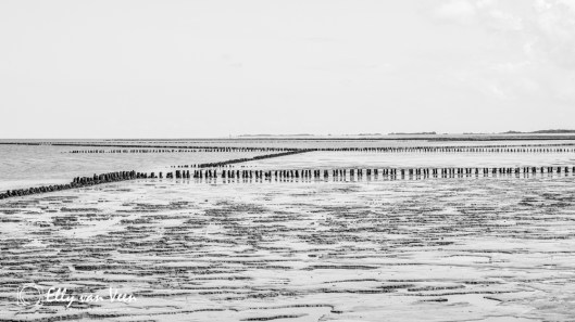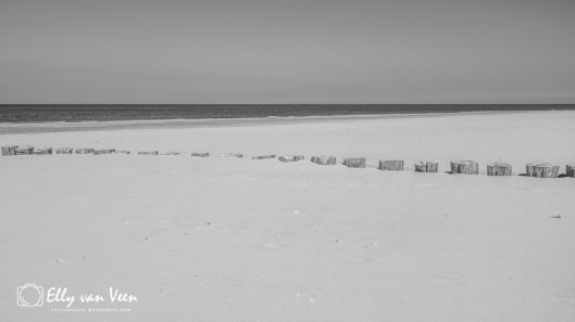 Aan het strand liggen vele rijen golfbrekers, wat altijd een mooi lijnenspel geeft