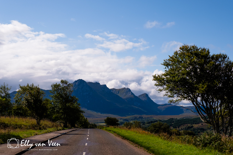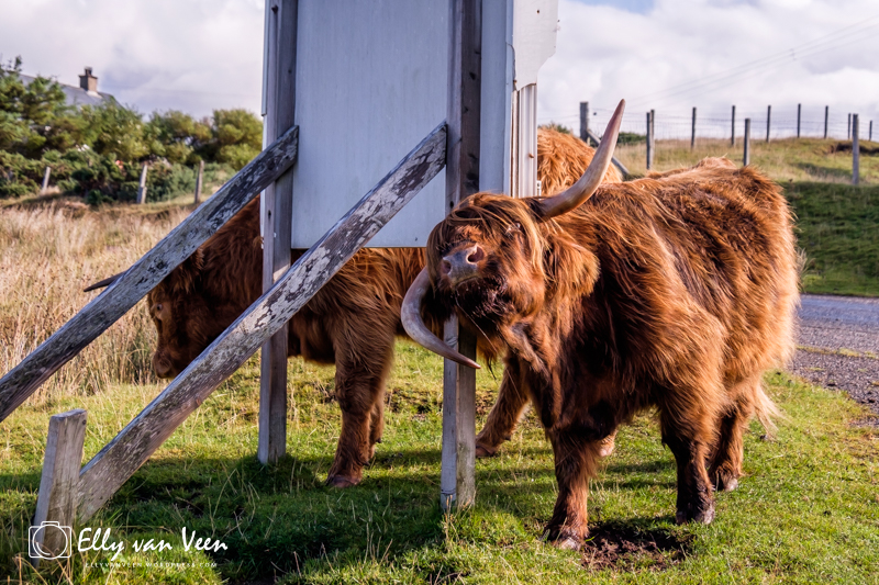 Op dag 3 vertrekken we op tijd naar ons volgende hotel in Rhiconich. Al snel verandert het landschap. De heuvels worden bergen, het landschap wordt minder groen en de eerste Schotse Hooglanders lopen keurig rechts langs de weg. Wat een beesten! De (verkeers)borden staan scheef langs de weg, want het zijn heerlijke schuurpalen. Je zal maar jeuk hebben!