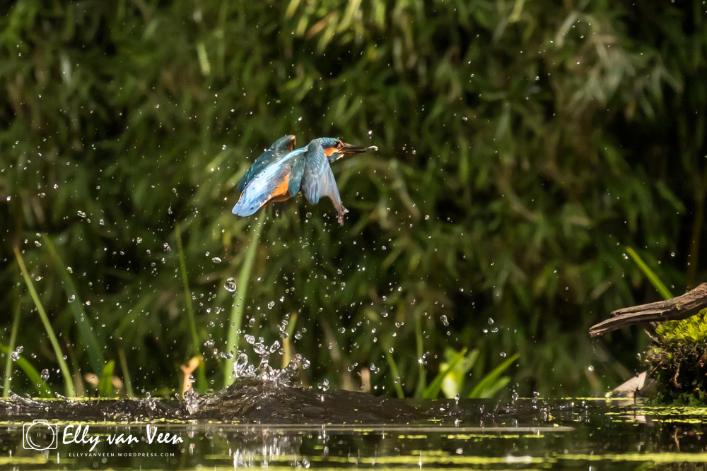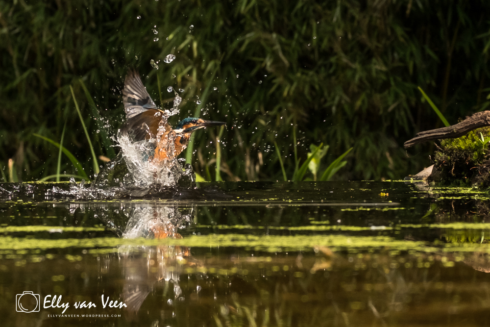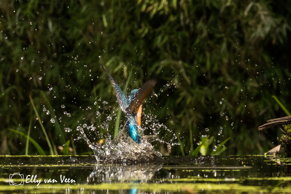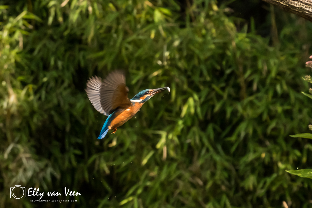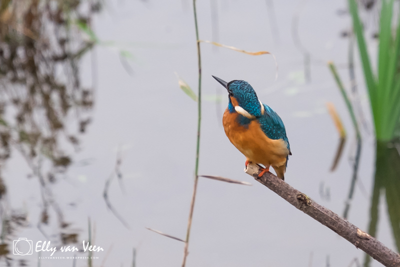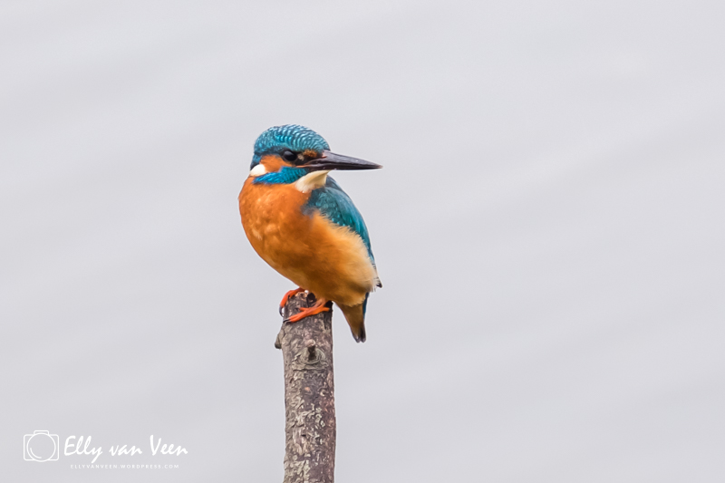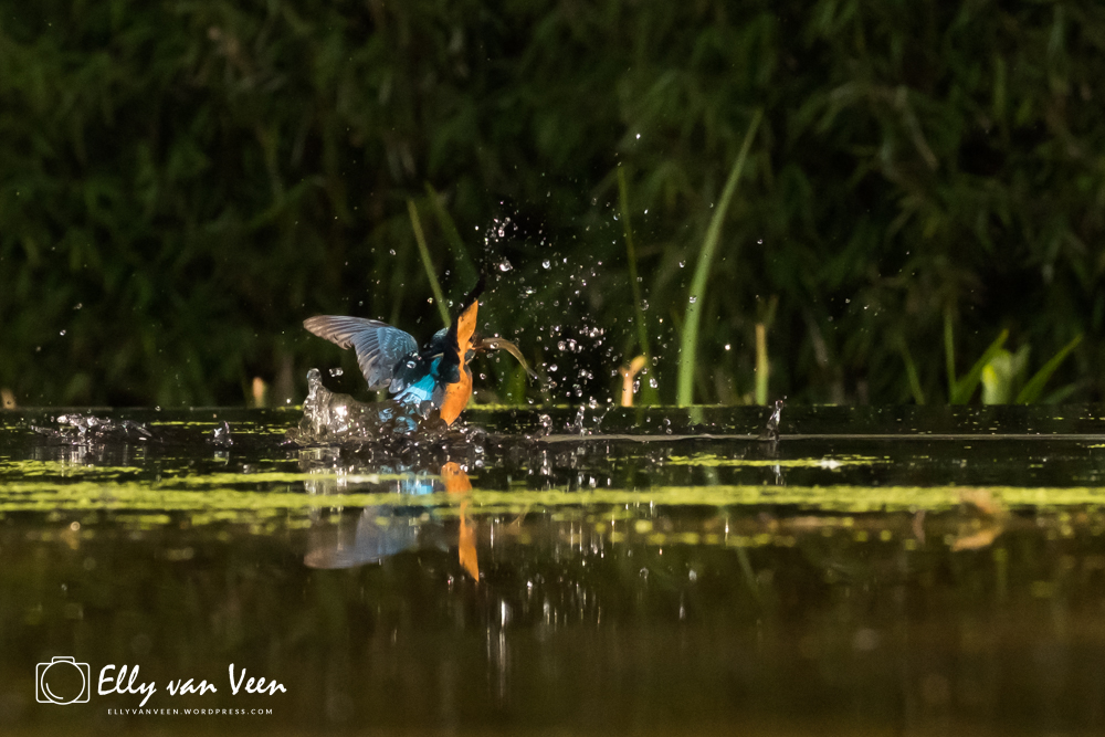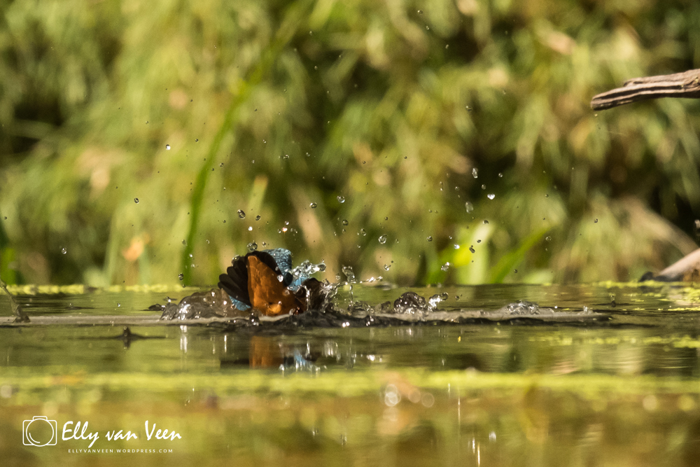 Onderweg nog wat gepraat met 2 mannen, die op zoek waren naar de wilde zwanen. Er schijnen er 7 te zijn in het Oostvaardersveld. Aan het eind van de wandeling waren we bij de hut waar het IJsvogeltje volgens de roeptoeters niet meer kwam. Maar na een paar minuten zat ie er al. Ik heb echt zo stom gedaan, totaal verkeerde instellingen van de camera, waardoor er bijna geen foto scherp is. En het ijsvogeltje deed zo zijn best met de hoevangikeenvis-demonstratie. Het was een feest om naar te kijken, keer op keer dook ie weer het water in. Er gaat heel wat vis in zo’n klein vogeltje!!