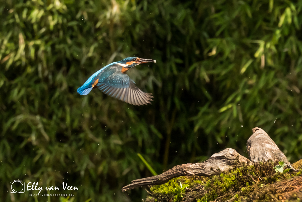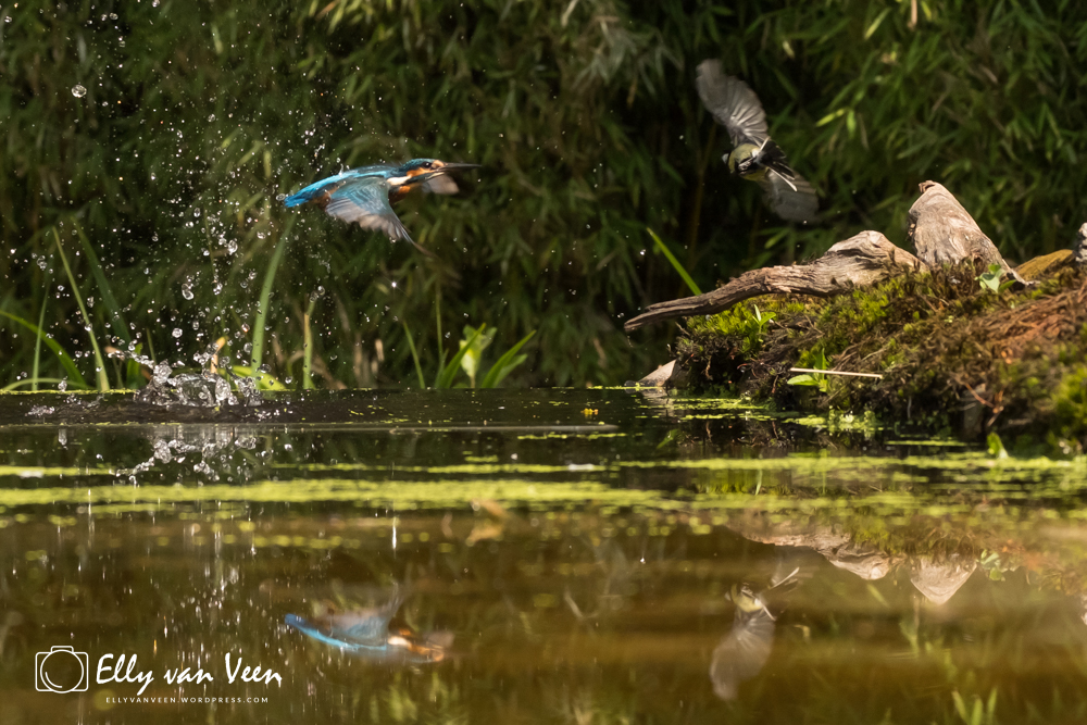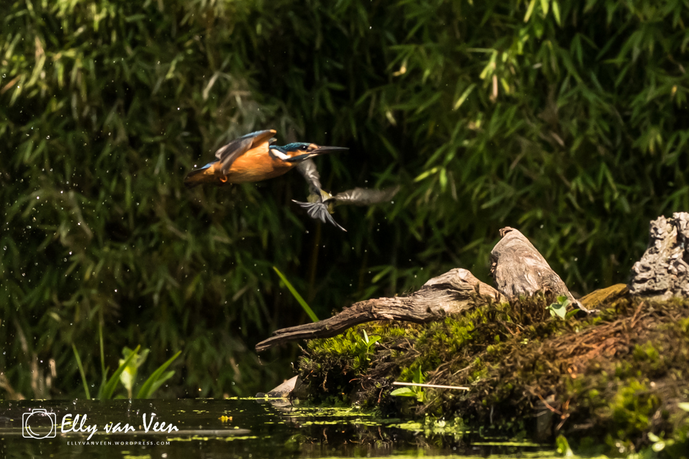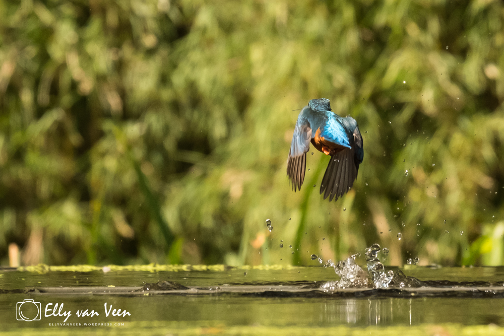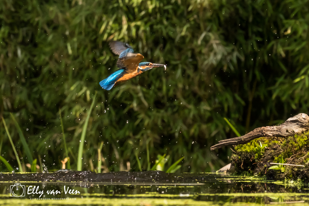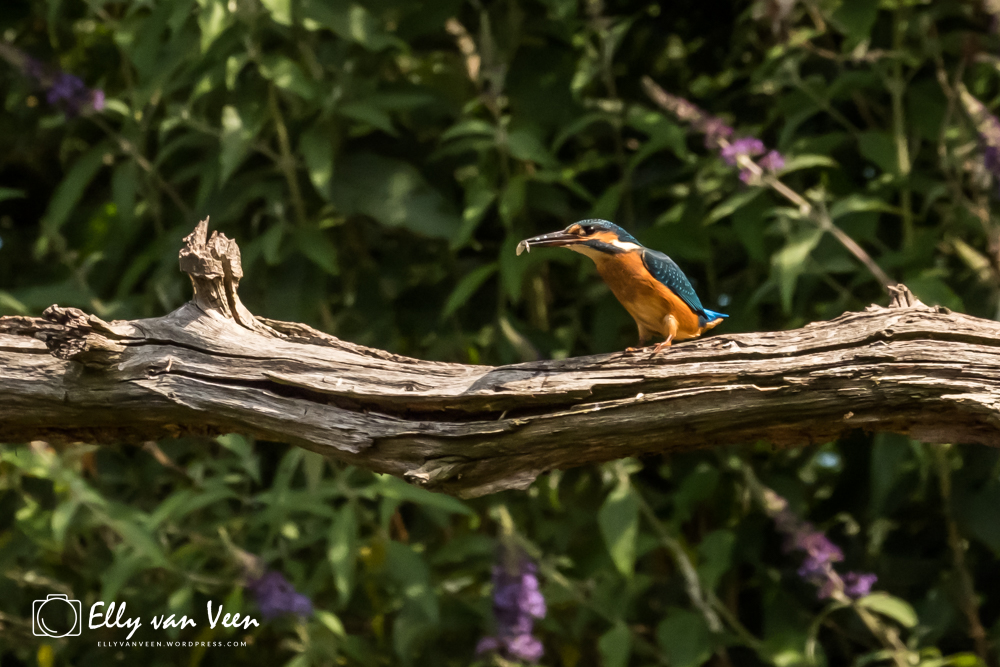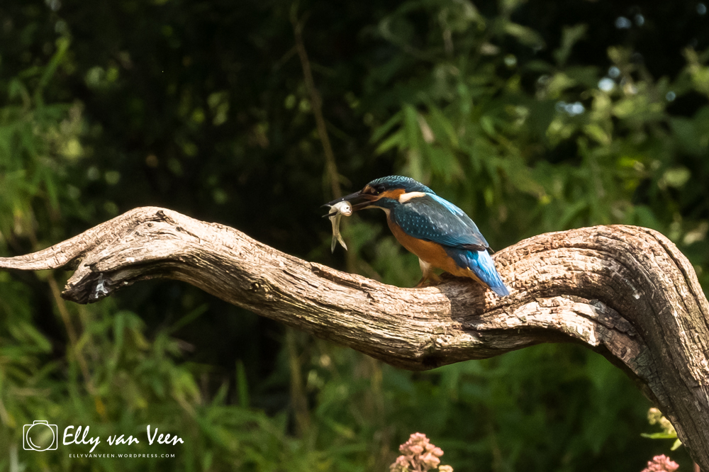 Onderweg nog wat gepraat met 2 mannen, die op zoek waren naar de wilde zwanen. Er schijnen er 7 te zijn in het Oostvaardersveld. Aan het eind van de wandeling waren we bij de hut waar het IJsvogeltje volgens de roeptoeters niet meer kwam. Maar na een paar minuten zat ie er al. Ik heb echt zo stom gedaan, totaal verkeerde instellingen van de camera, waardoor er bijna geen foto scherp is. En het ijsvogeltje deed zo zijn best met de hoevangikeenvis-demonstratie. Het was een feest om naar te kijken, keer op keer dook ie weer het water in. Er gaat heel wat vis in zo’n klein vogeltje!!