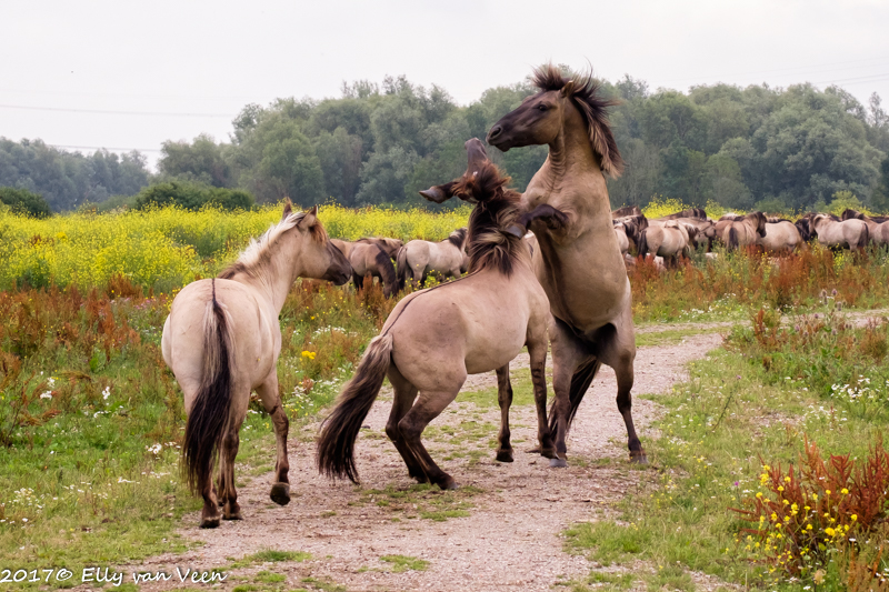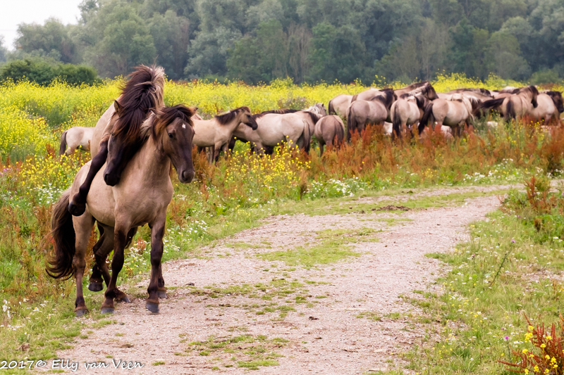 Vanochtend hebben Sandra en ik een lange, heel lange wandeling gemaakt door de Oostvaardersplassen. Na 3 uur was het mooi geweest en wilden we huiswaarts. We zagen veel mensen staan bij de kudde Konikpaarden. Zullen we?? Ja, nog even dan…