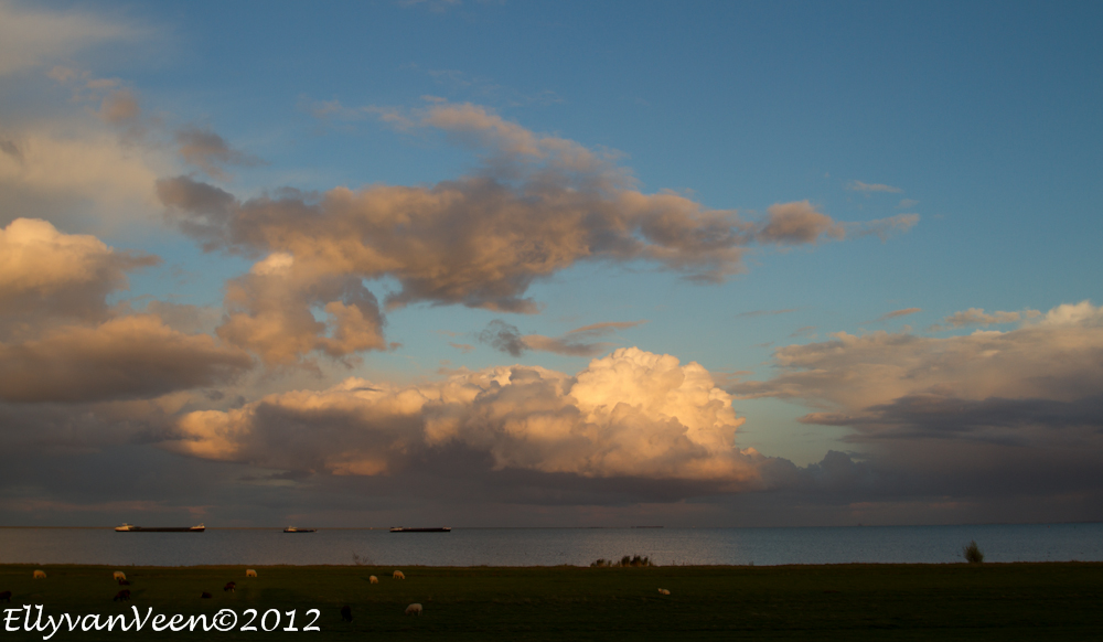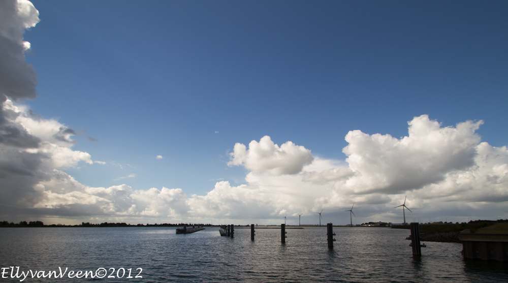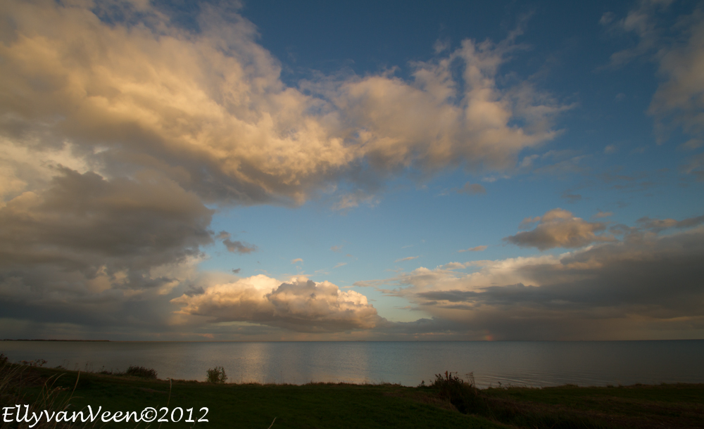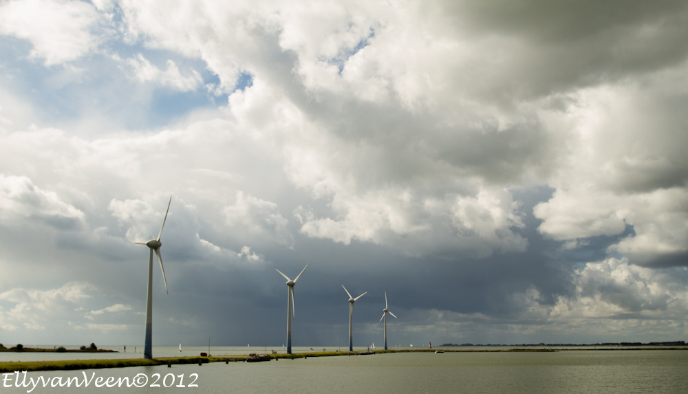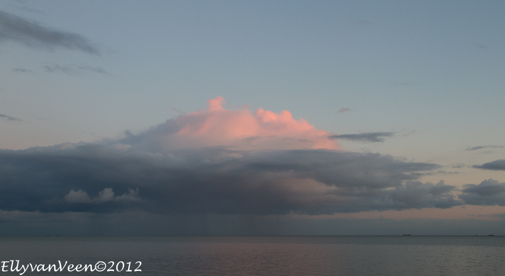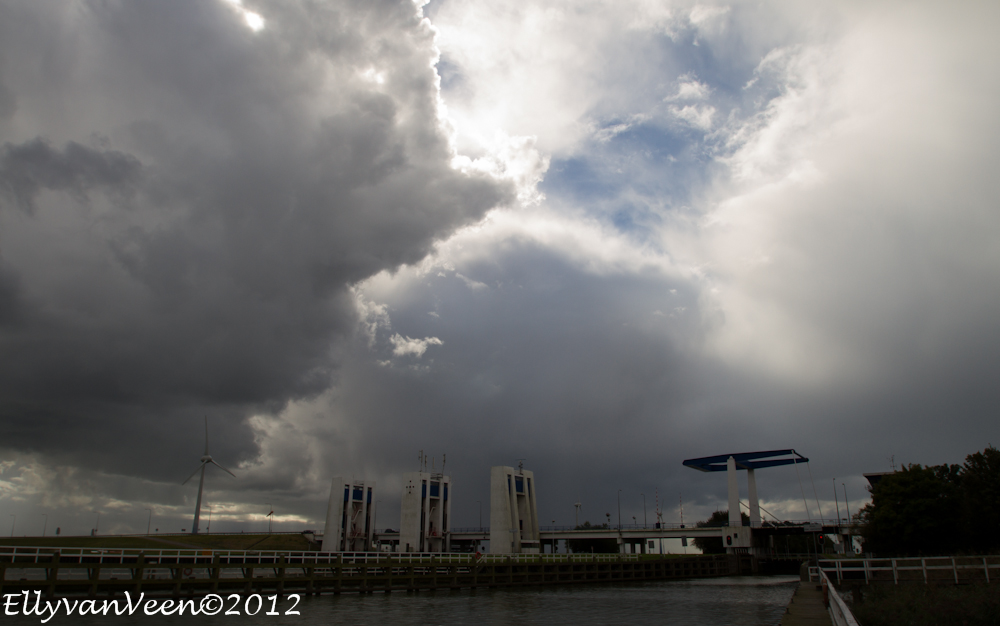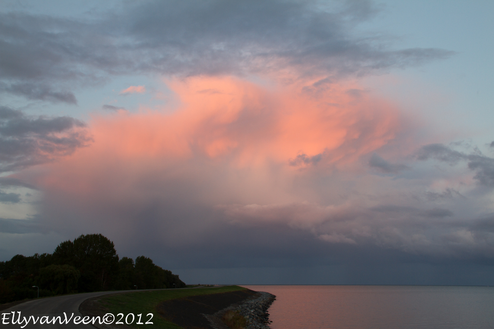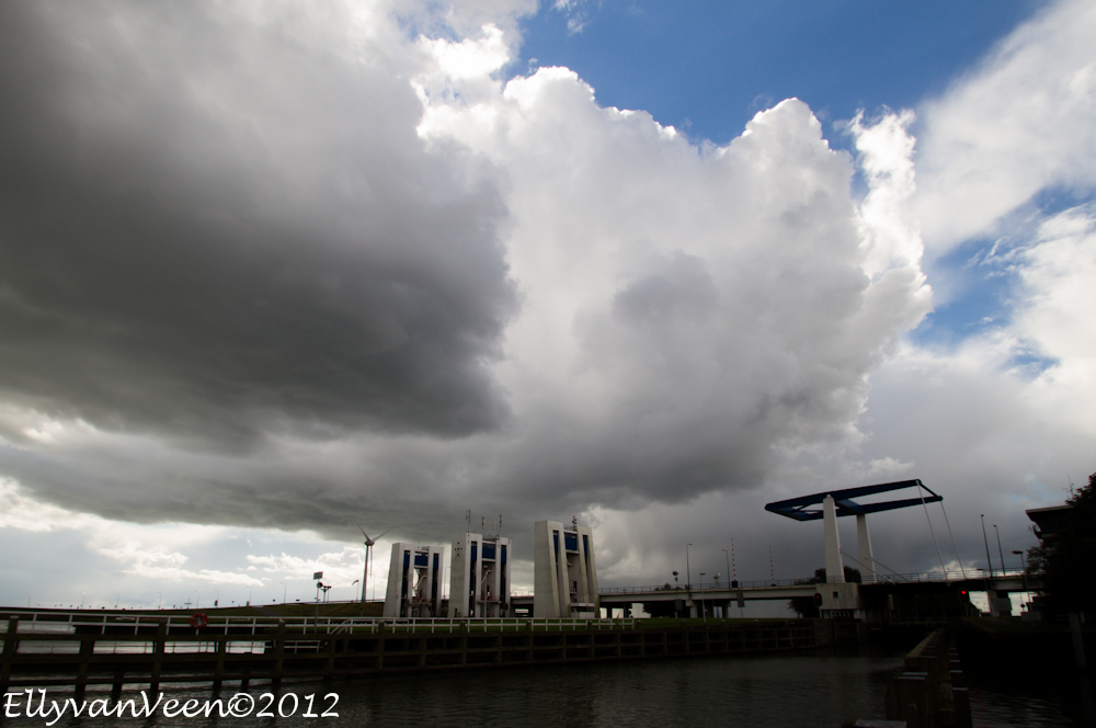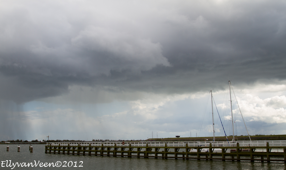 Na de hittegolf van afgelopen week sloeg het weer om. Als je vlak bij het Markermeer woont, loont het de moeite om te gaan kijken. Opeens werd het gisteravond zwart en kwam er een enorme bui over het water onze kant op.