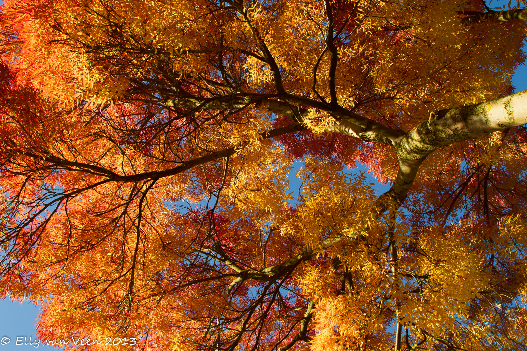 Onderstaande foto had ik in de herfst gemaakt. De boom stond in een klein voortuintje in een dichte woonwijk. De boom mooi solitair op de foto ging dus niet lukken. Ik heb er een tijdje naar staan te kijken en heb toen onderstaande foto gemaakt. Ik was er tevreden over, de kleuren vind ik prachtig maar toch…maar toch….het zinde me niet….Elly-aangepast 1